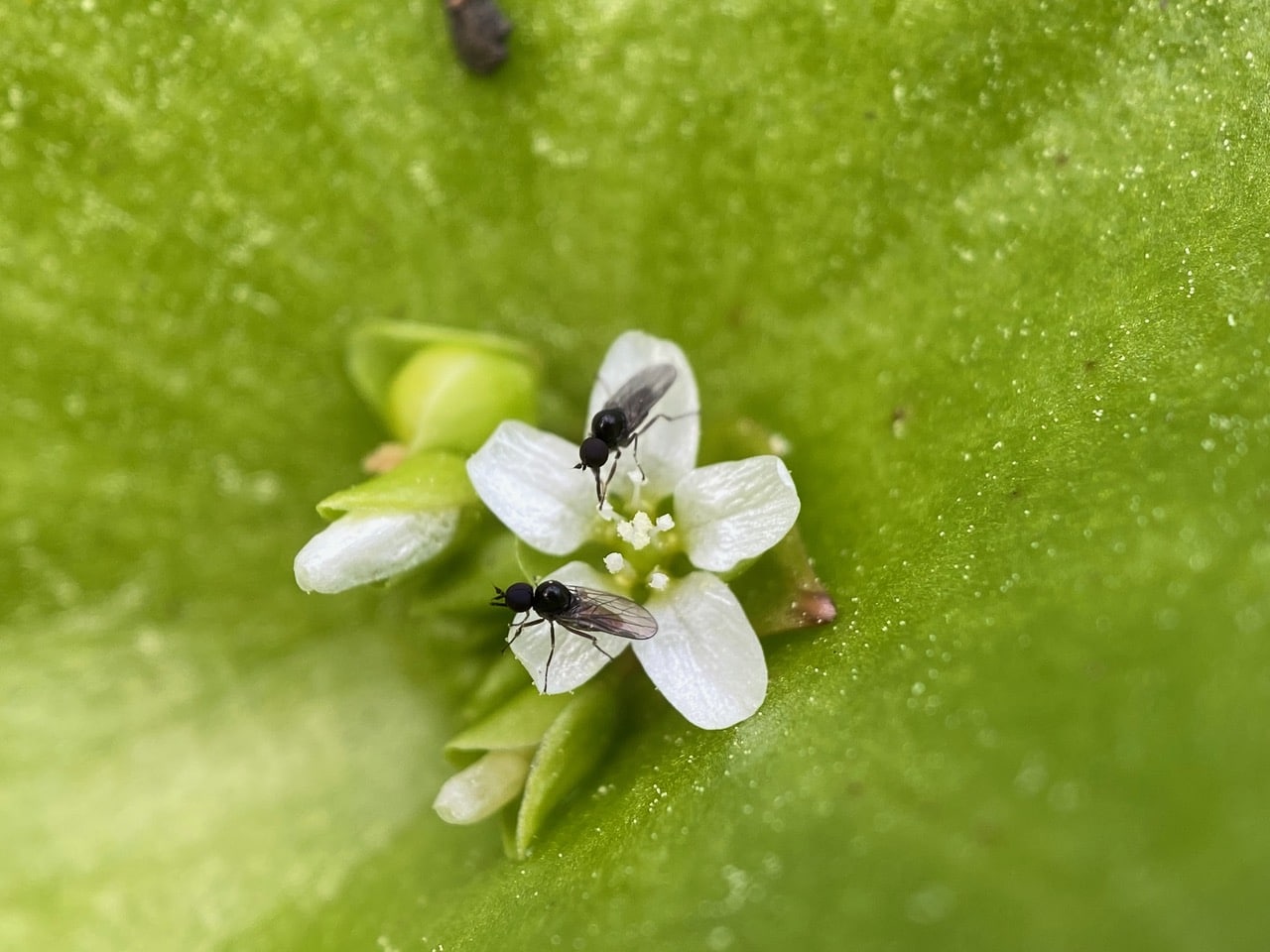Around a Miner’s Lettuce flower, two Hybotid Dance Flies are scavenging spilled pollen on the perfoliate leaf.