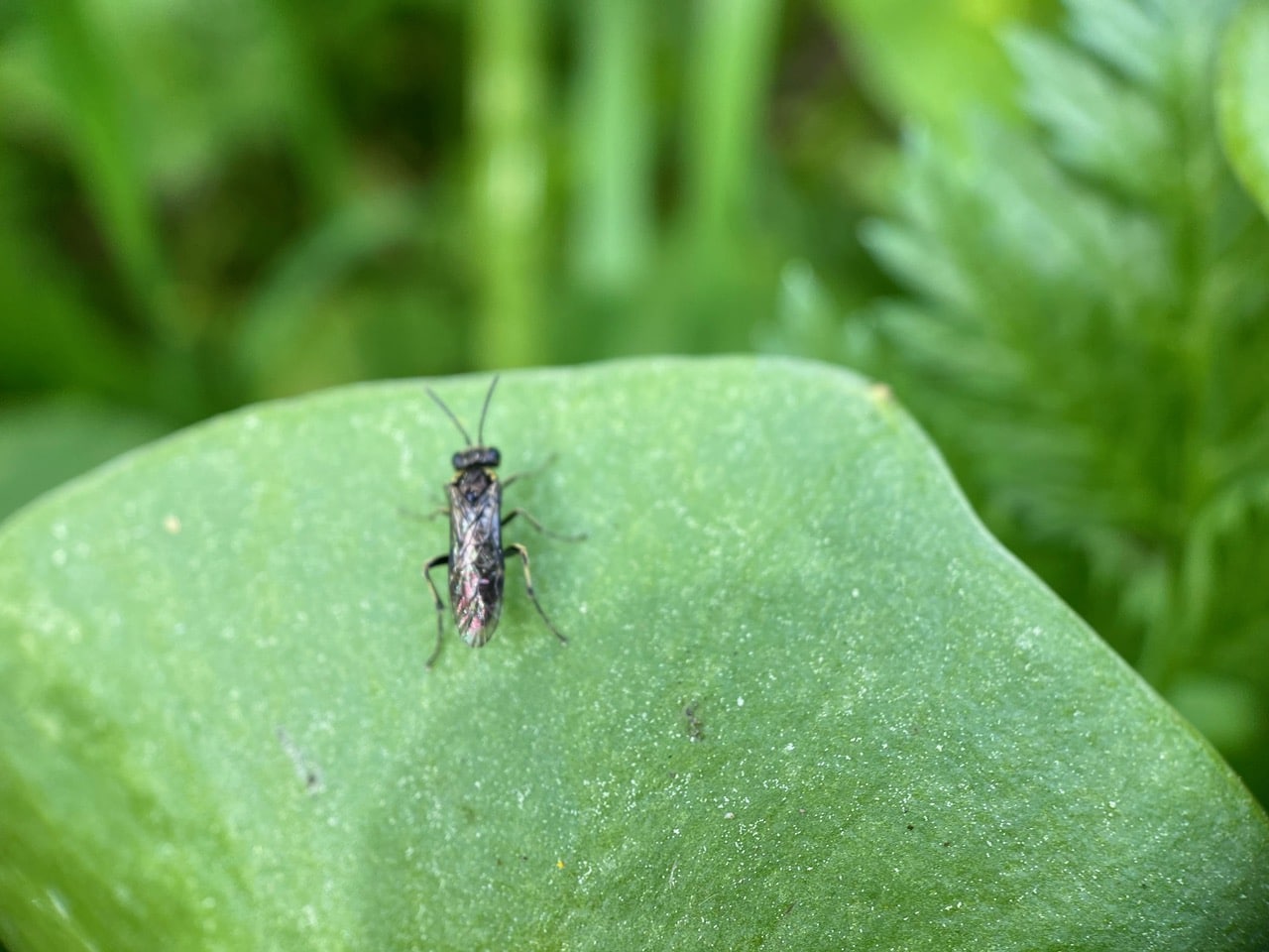 In a flash, a Sawfly, Filacus sp. (family Tenthredinidae) lands on a leaf of Miner’s Lettuce.