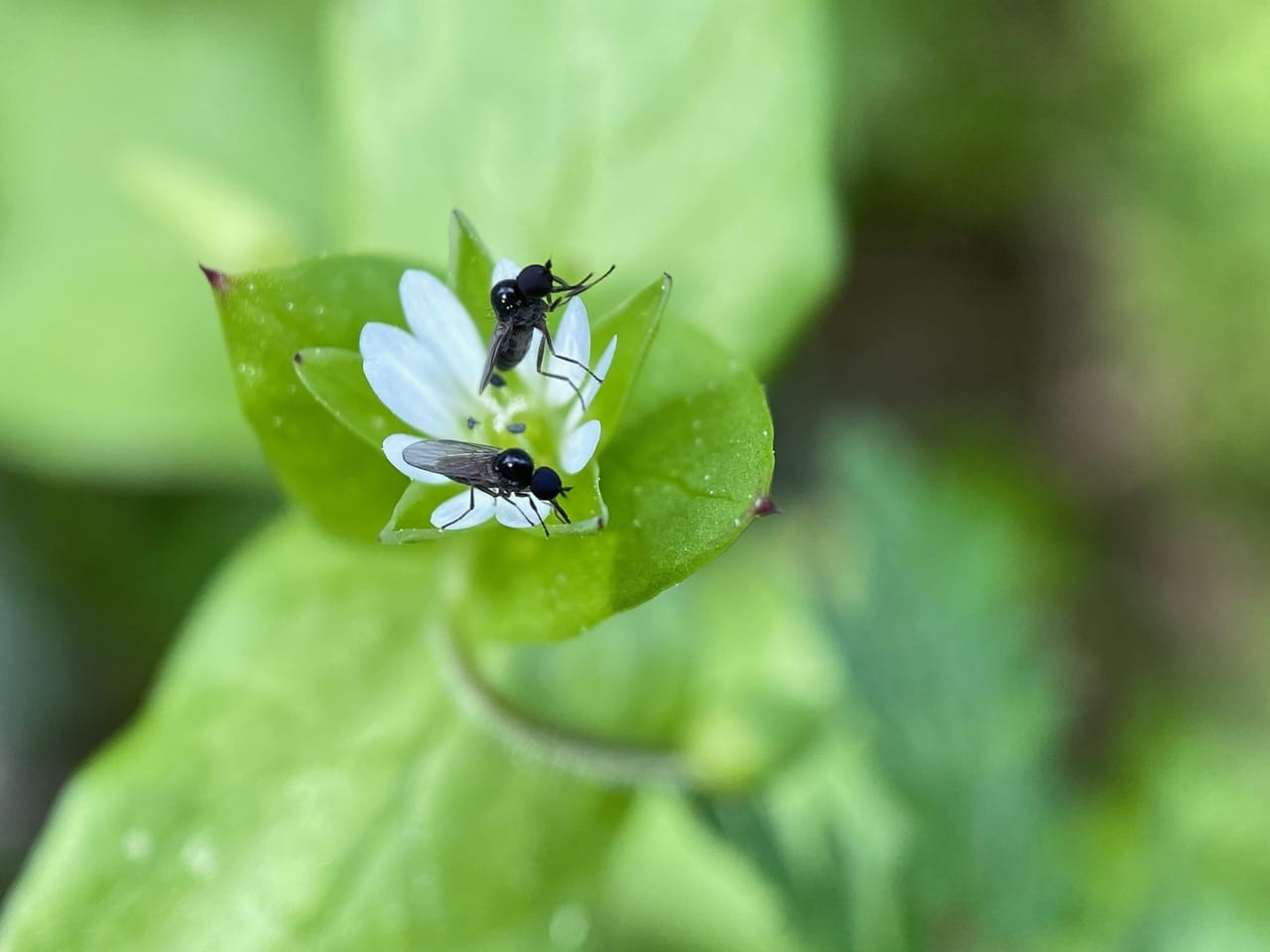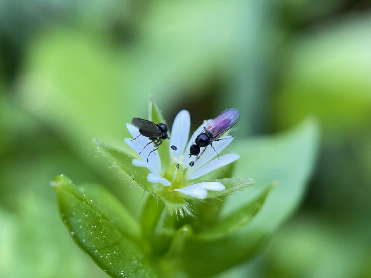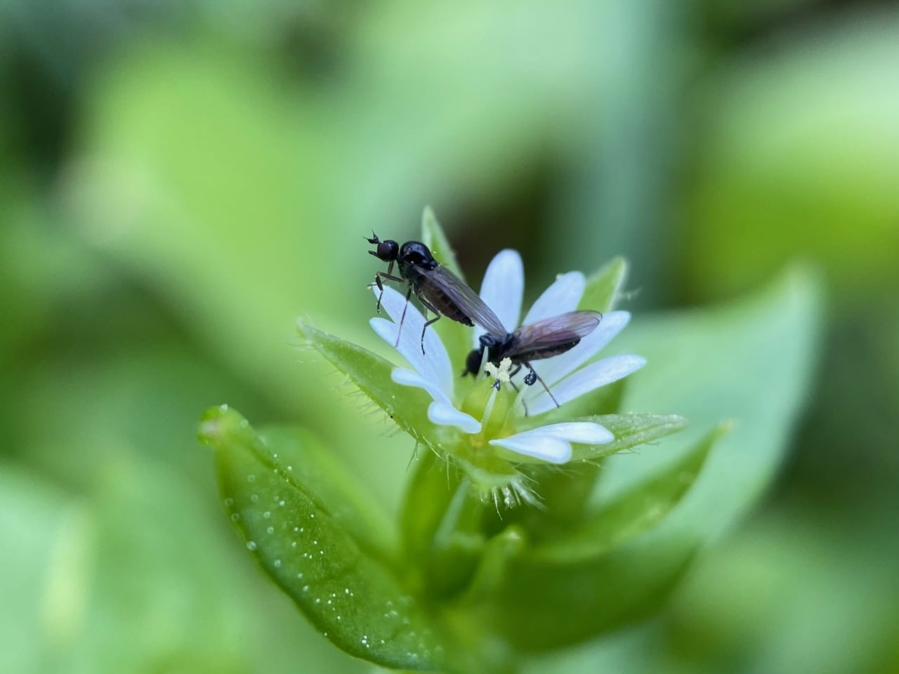 In the shade, two small Dance Flies, Anthalia sp. (family Hybotidae) are foraging on a chickweed flower.