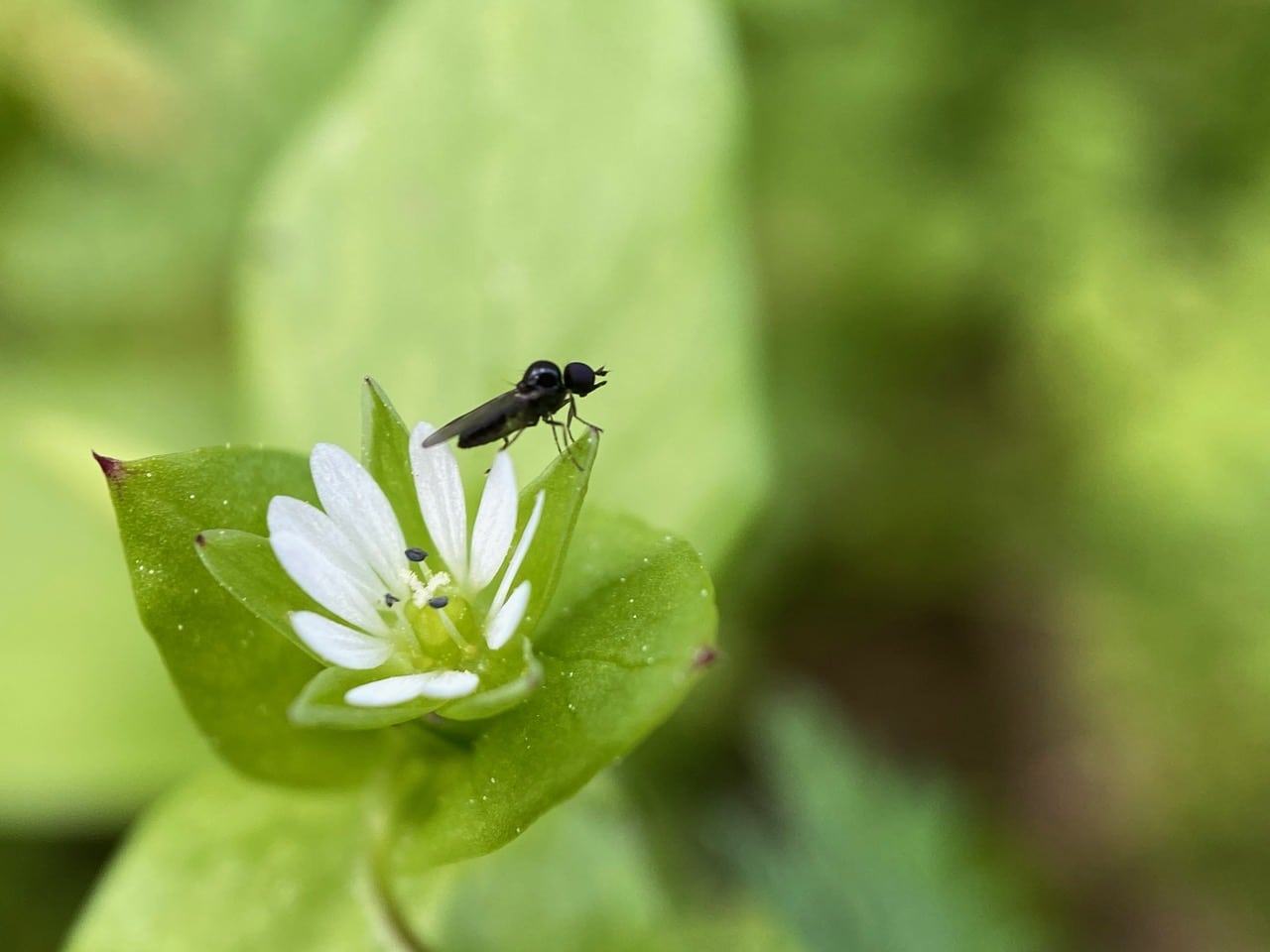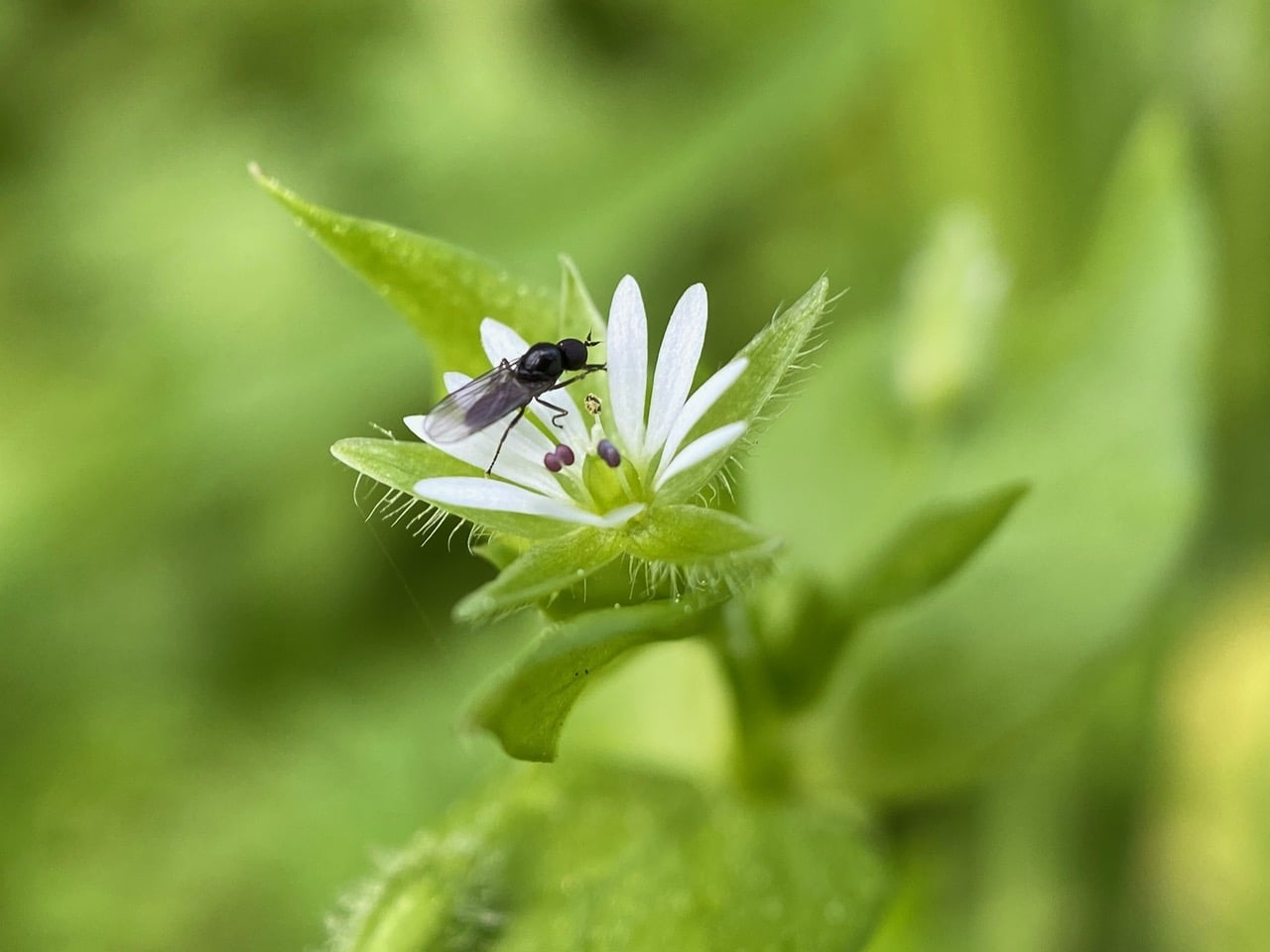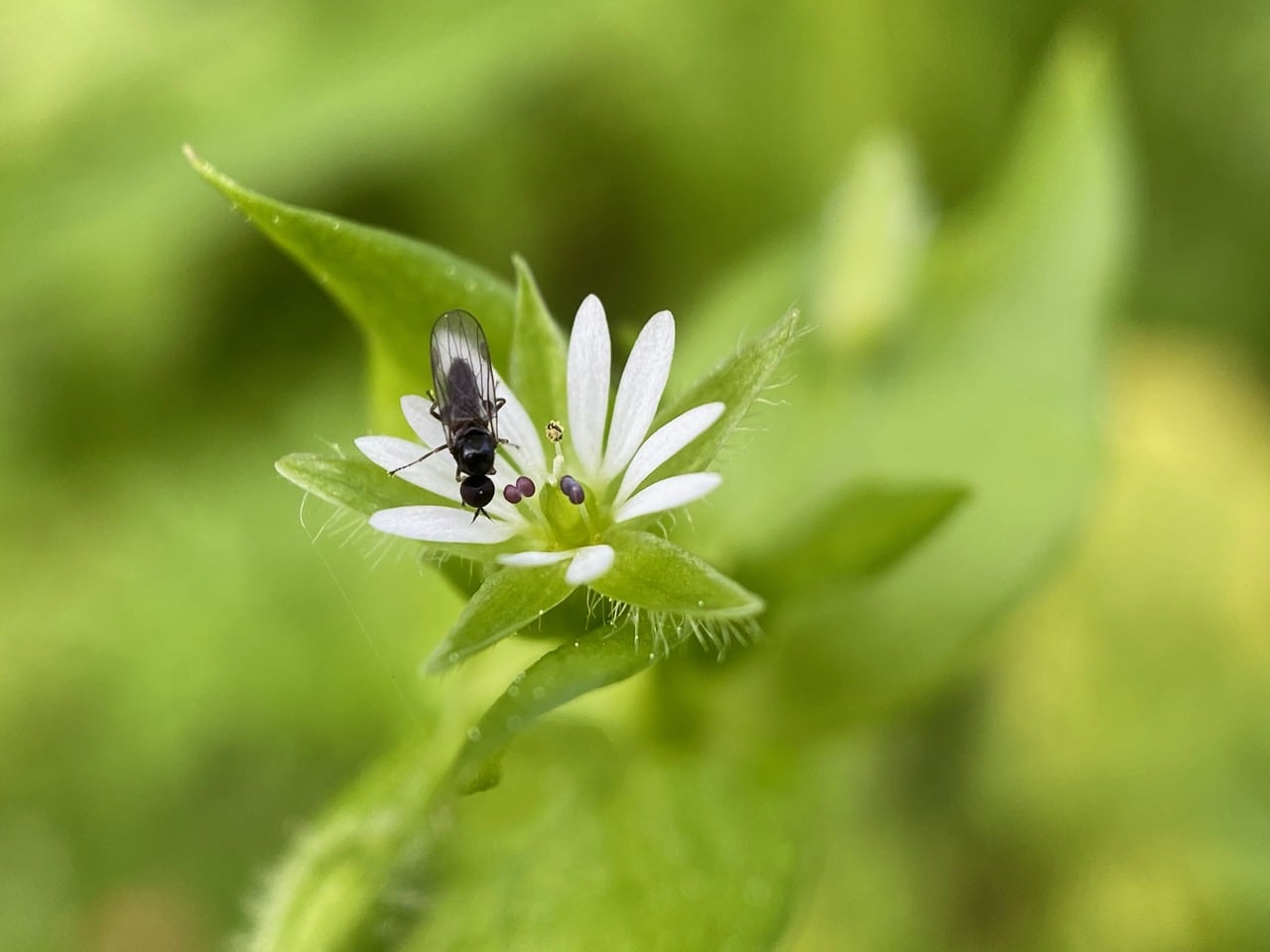This chickweed flower is at the stage when its stamens are releasing pollen. The Hybotid Dance Flies that visit get covered with pollen.