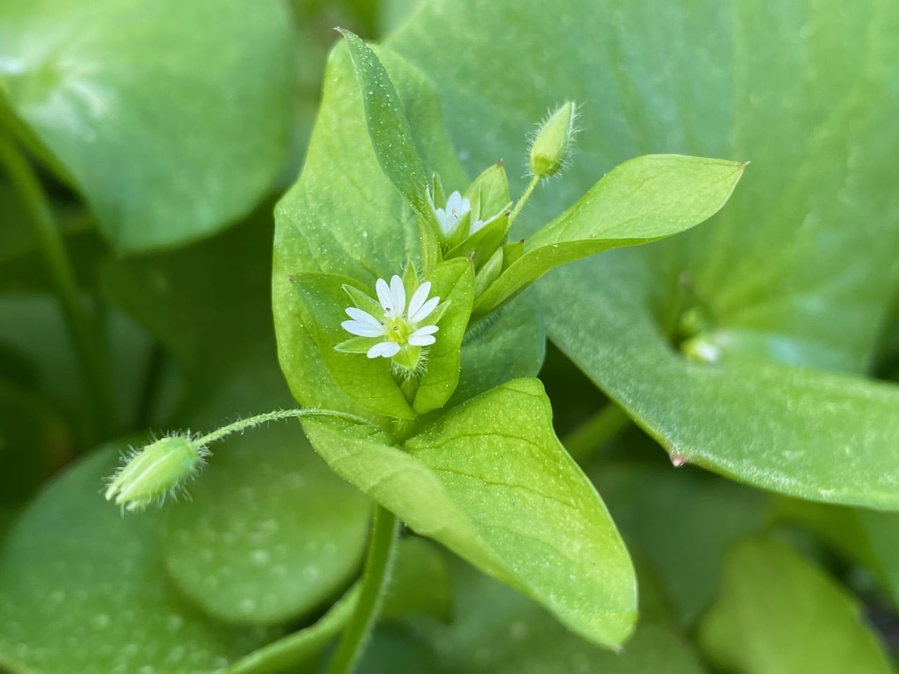 The chickweed flower appears to have 10 white petals, but actually there are only 5 deeply dissected petals. There are 5 stamens surrounding a 3-lobed style. The flower is supported by a calyx made of 5 sepals that form a flaring cup.