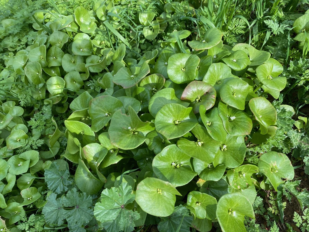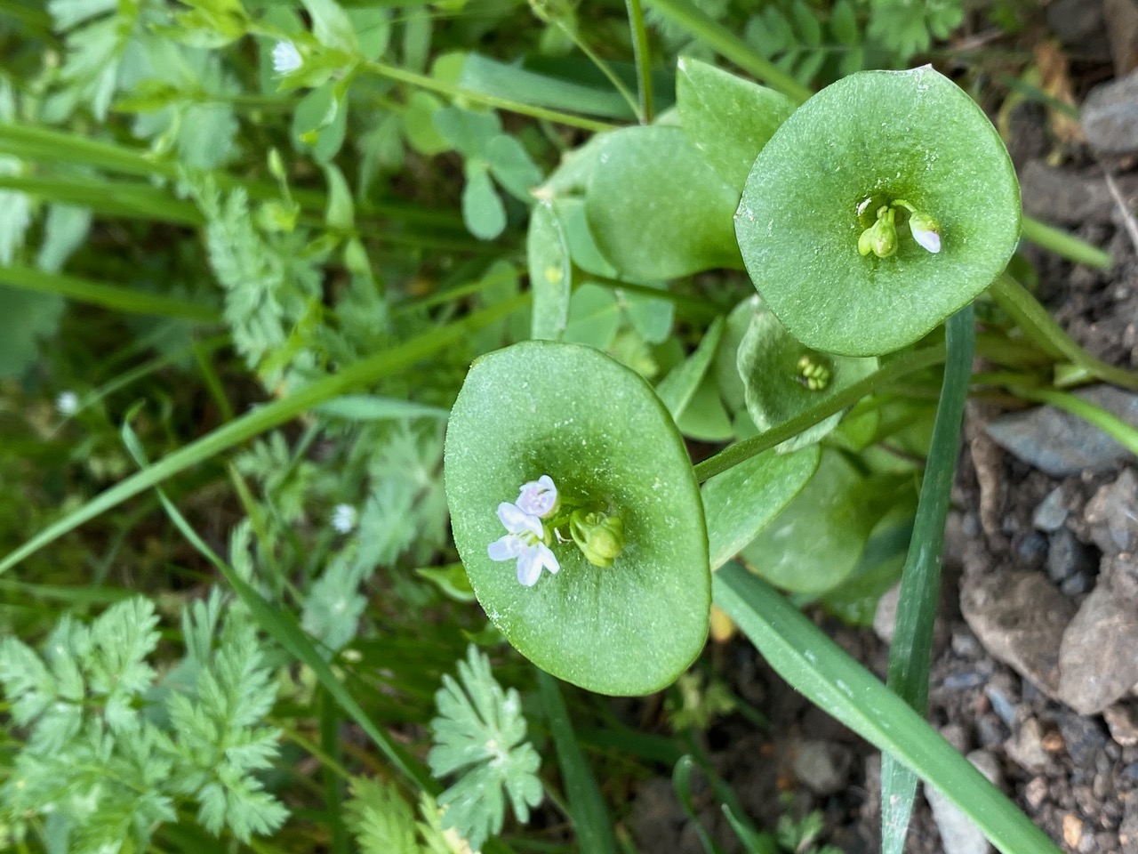 Miner’s Lettuce, Claytonia perfoliata is rather unique in that the leaves at the flower stem are fused together, forming a circular structure around the stem (“perfoliate”). The flowers are small, white to pale pink, growing in clusters from the center of the perfoliate leaf. Each flower has 5 petals, 2 sepals, 5 stamens, and one pistil with 3 stigmas.