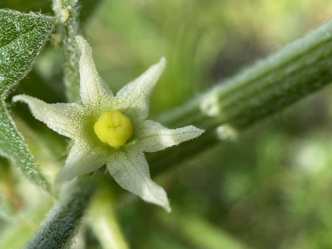 Close-up of a female Marah flower. The large stigma in the center is moist and sticky at maturity, the better to receive pollen delivered inadvertently by small insects visiting for nectar. The ovary of a female flower is “inferior”, located beneath the corolla. After pollination, the ovary develops into the spiky fruit we are familiar with. Surprisingly, despite the profusion of flowers on this plant, I am not seeing any insect visitors. Elsewhere I have observed American Winter Ants, Argentine Ants, a Braconid Wasp, and a Fungus Gnat visit the male Marah flowers and come away with sticky pollen.