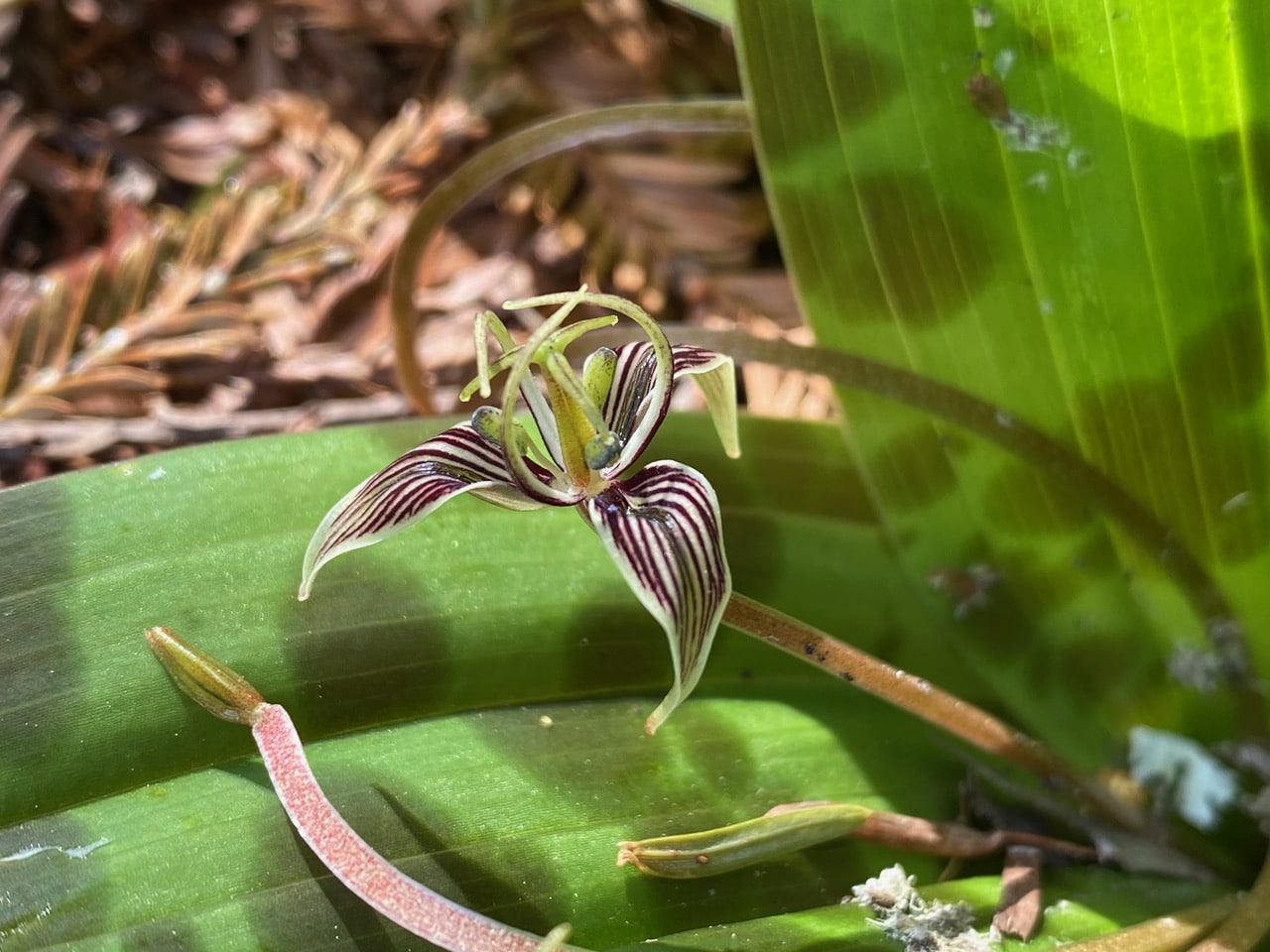 The most conspicuous part of the flower are not the petals, but rather the sepals. These are lance-shaped, pale and striped with dark purple. The narrow, linear petals are shown here curving over the reproductive parts. The three short stamens are located at the bases of the sepals. The stout, erect style in the center has three long lobes. The whole arrangement is optimized for showering the fungus gnat with pollen from the ripe anthers while the insect, guided by the nectar guides, makes its way down the center of the flower for the sweet reward. Whatever pollen from another flower that is already on the gnat’s back might be rubbed off on the stigmatic surfaces of the style arms looming over the insect. Pollination accomplished!