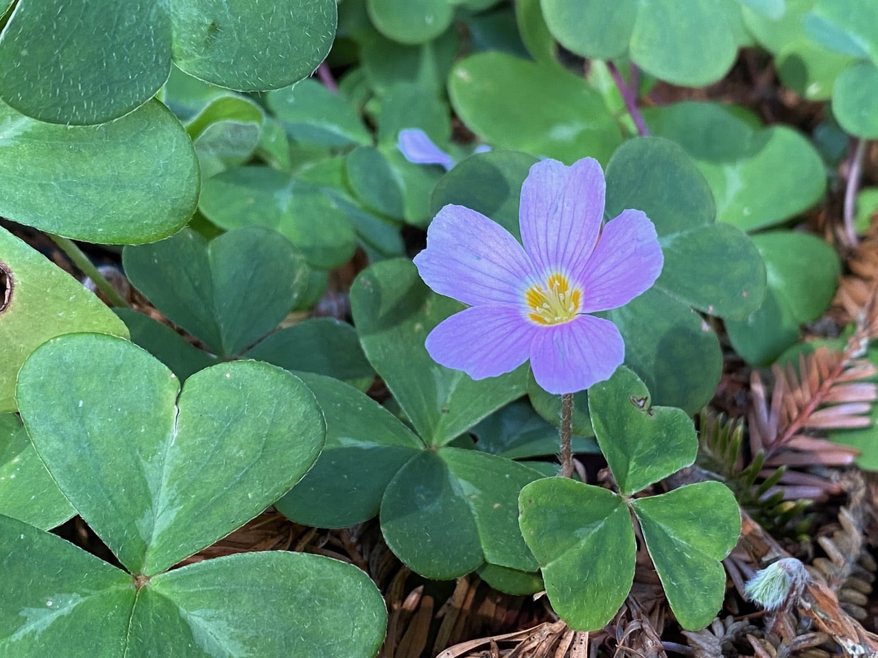Large patches of Redwood Sorrel, Oxalis oregana (family Oxalidaceae) cover the soft duff in the Redwood section of the garden. Each clover-like leaf is composed of three heart-shaped leaflets, with purplish undersides. The species, native to moist and shady coast redwood forests of western North America, is able to photosynthesize at relatively low levels of ambient sunlight. Normally the red or purple pigments in plants, called anthocyanin, serves as a sunscreen in leaves, protecting them from high light stress. So why is the pigment on the underside of the sorrel leaves? Probably to sequester every photon of light coming through for photosynthesis. When direct sunlight strikes the leaves they fold downward; when shade returns, the leaves reopen. This is a protective response to prevent the shade-loving plant from getting sunburned. Taking only a few minutes, this movement is observable in real time.