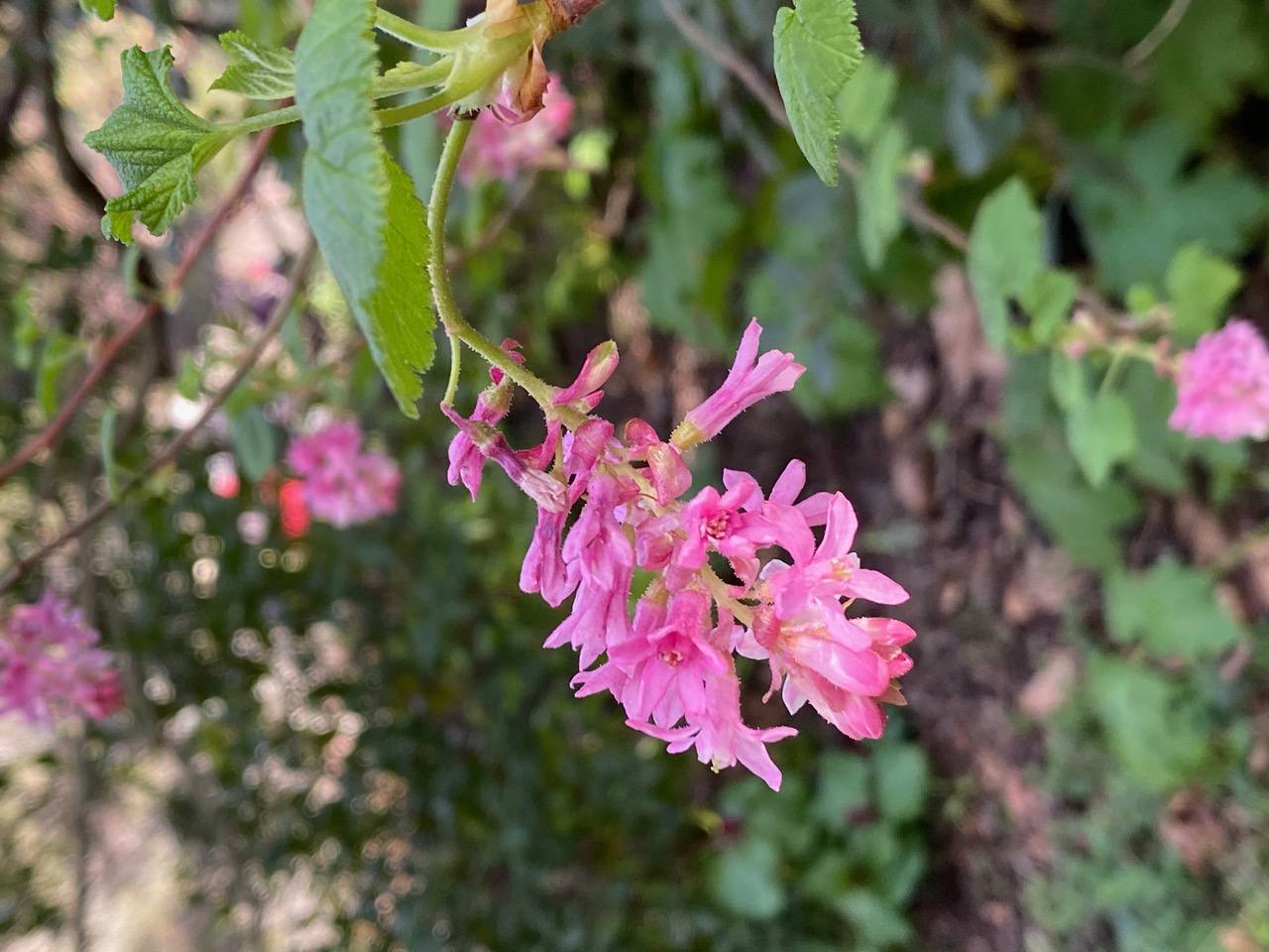 Next to the trillium patch is a blooming Pink-flowering Currant, Ribes sanguineum. I enjoy the sight of a Black-tailed Bumble Bee work the flowers. This is another early bloomer that supports bumble bees. It is a popular garden plant because of its attractive, nodding pink inflorescences.