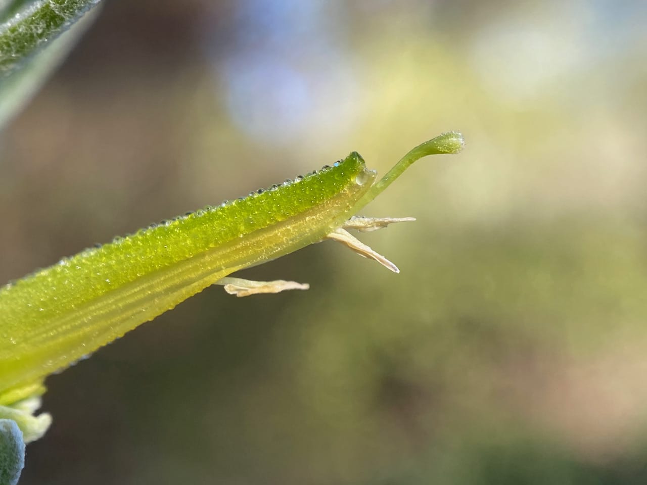 Here’s one of the inconspicuous flowers on the Indian Paintbrush. It might have been probed by the bill of a hummingbird seeking nectar. First time I see anthers sticking out of the corolla of Indian Paintbrush! The anthers are male structures that produce pollen. The slender green thing that curves upward out of the flower is the pistil (female reproductive structure) with a two-lobed stigma at the tip to receive incoming pollen from the bird’s head or neck. The plant is predominantly pollinated by hummingbirds.