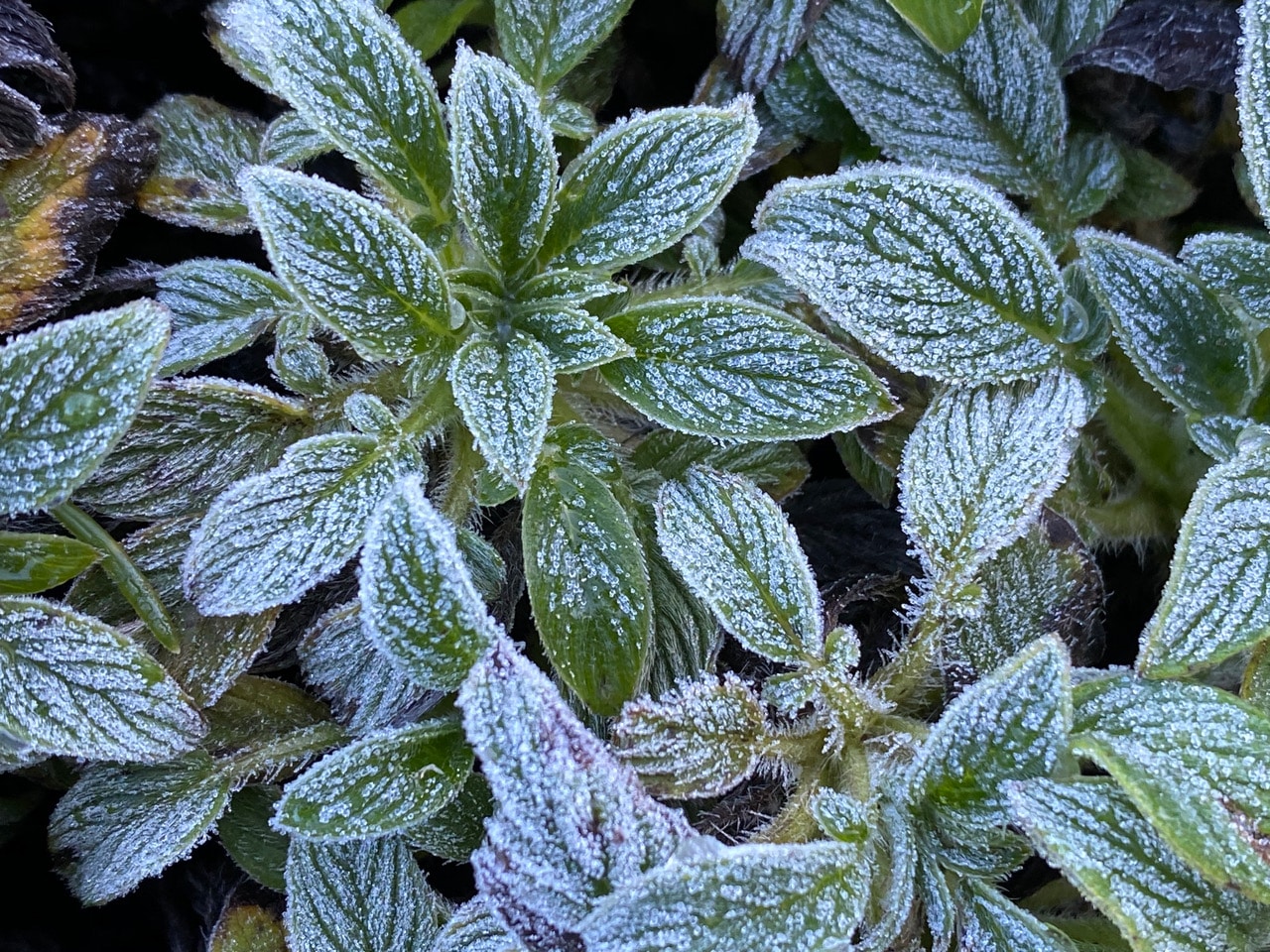 Tiny water droplets cling to the white tips of the leaves today.