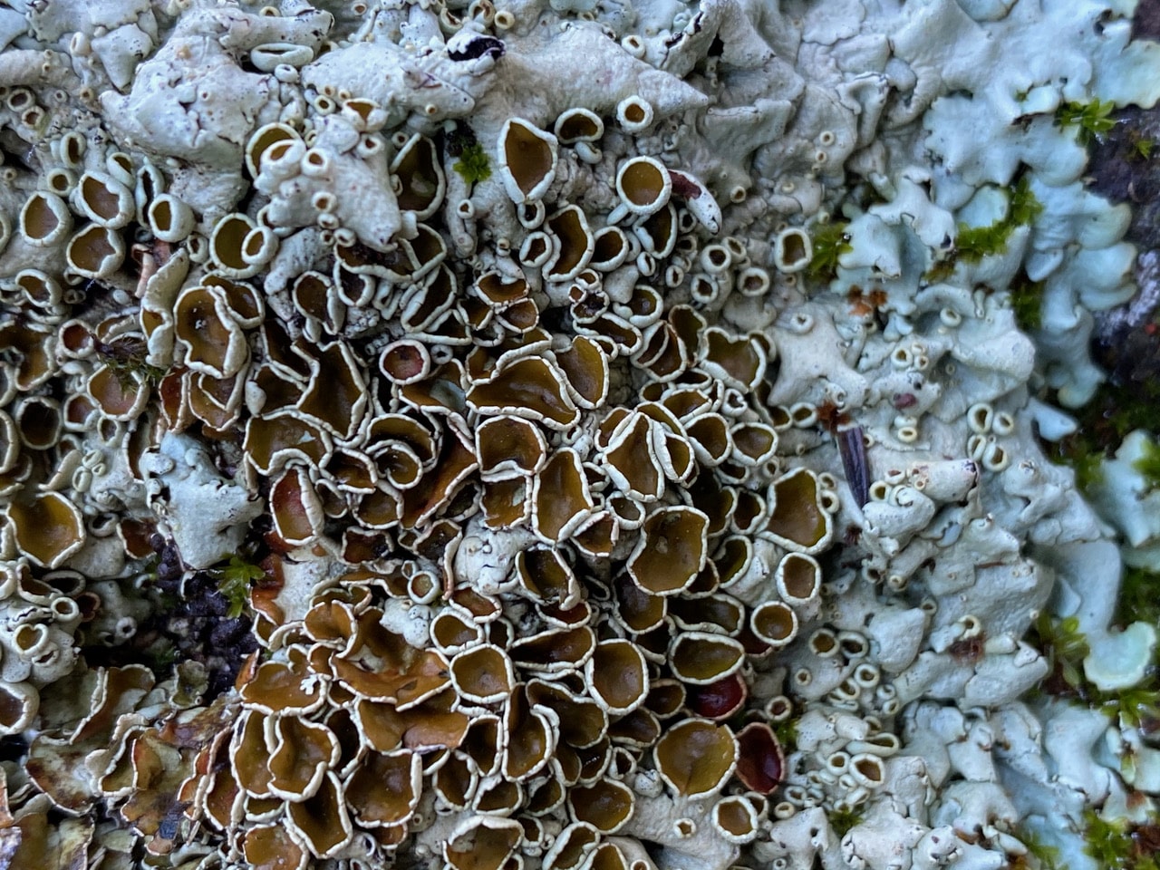Close-up of the lichen showing the disc-shaped apothecia that produce the fungal spores.