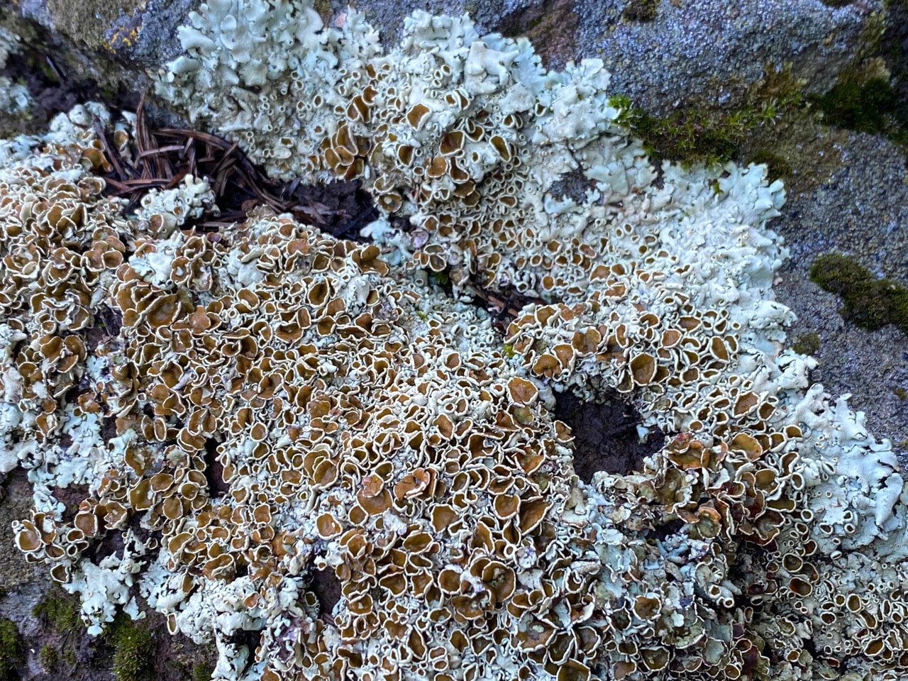 These brown, irregularly shaped discs are the apothecia, or the reproductive structures of the fungal component of the lichen that produce the spores. In sexual reproduction, only the fungal partner is reproduced. The spores that germinate must find the appropriate photobiont (algae) in order to form a new lichen. Since this is not a dependable process, lichens also resort to vegetative reproduction. Fragments of the lichen containing both the photobiont and the mycobiont (fungus) may break off and grow into a new lichen. In some lichens, specialized structures have evolved to facilitate this type of reproduction.