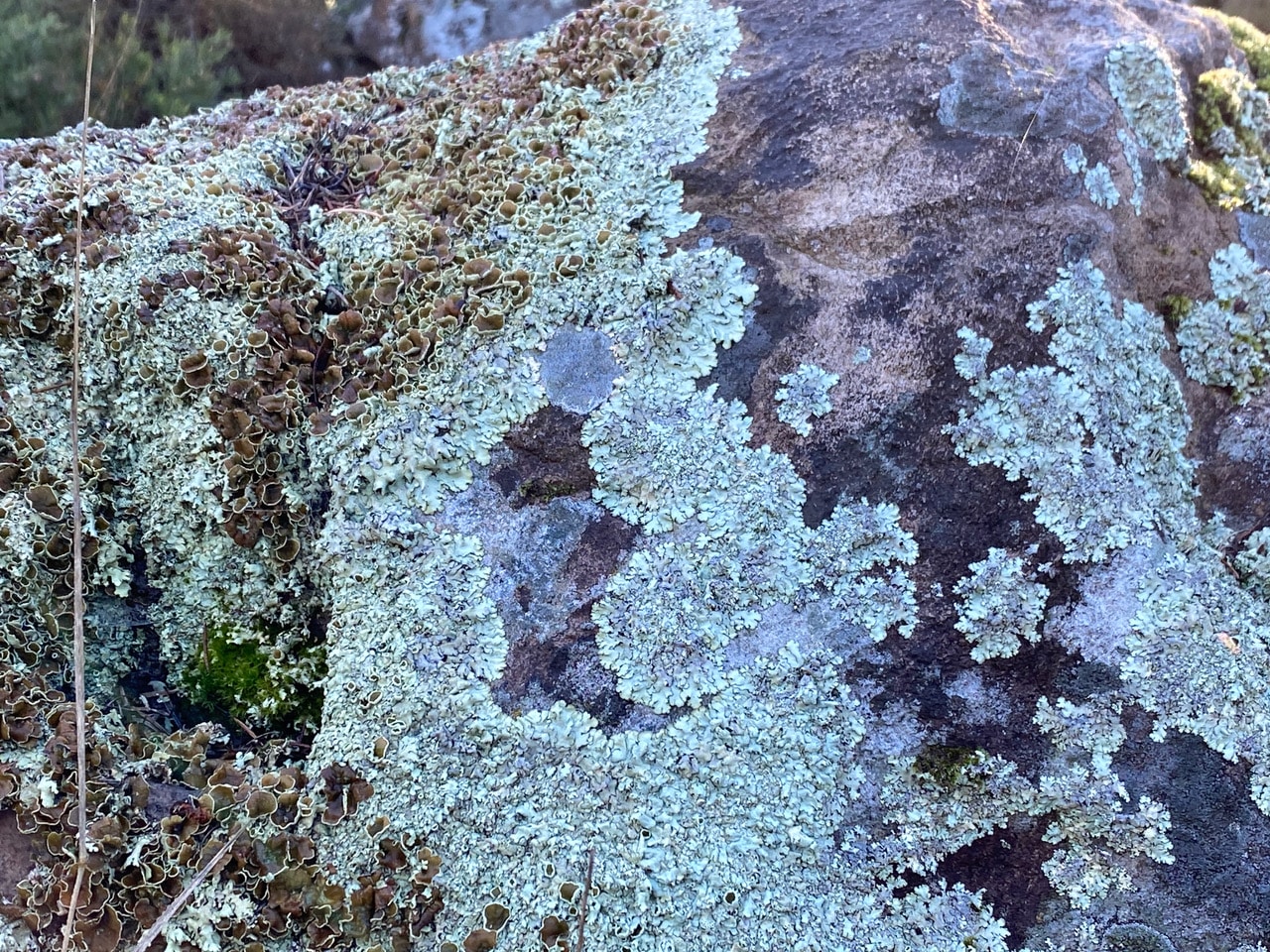 A large boulder is almost completely covered with the grey-blue lichen, Shingled Rock Shield, Xanthoparmelia stenophylla.