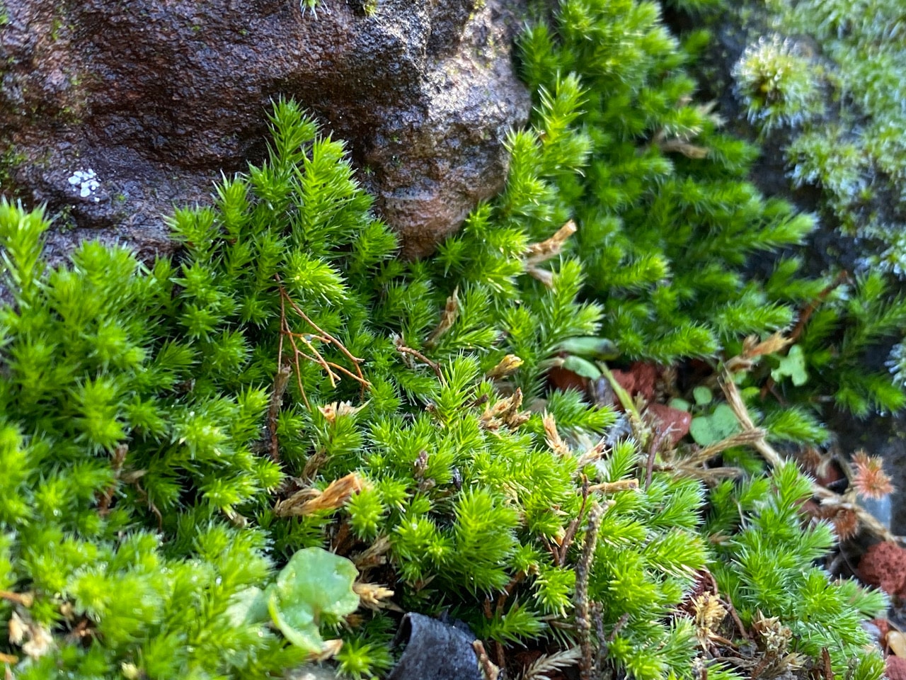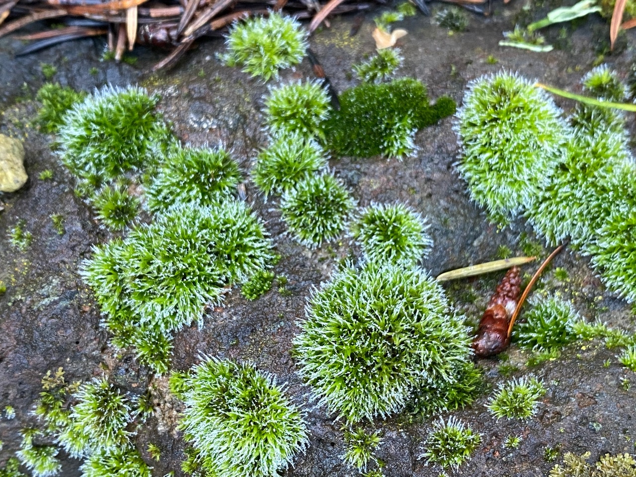 Discreet little mounds of the Grey-cushioned Grimmia, Grimmia pulvinata dot the surface of this rock. It is a common moss found on rocks, forming round, almost furry, grey cushions about 1-2 cm tall. A distinct character is the leaf tip, which is abruptly contracted into a long hair point, which may be as long as the leaf blade.