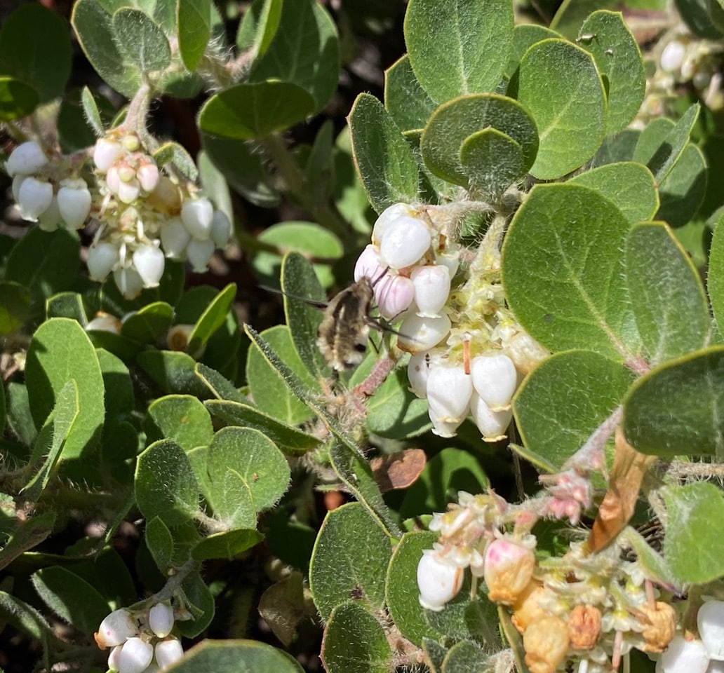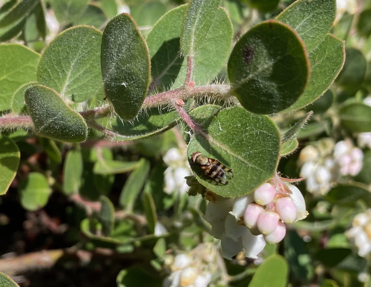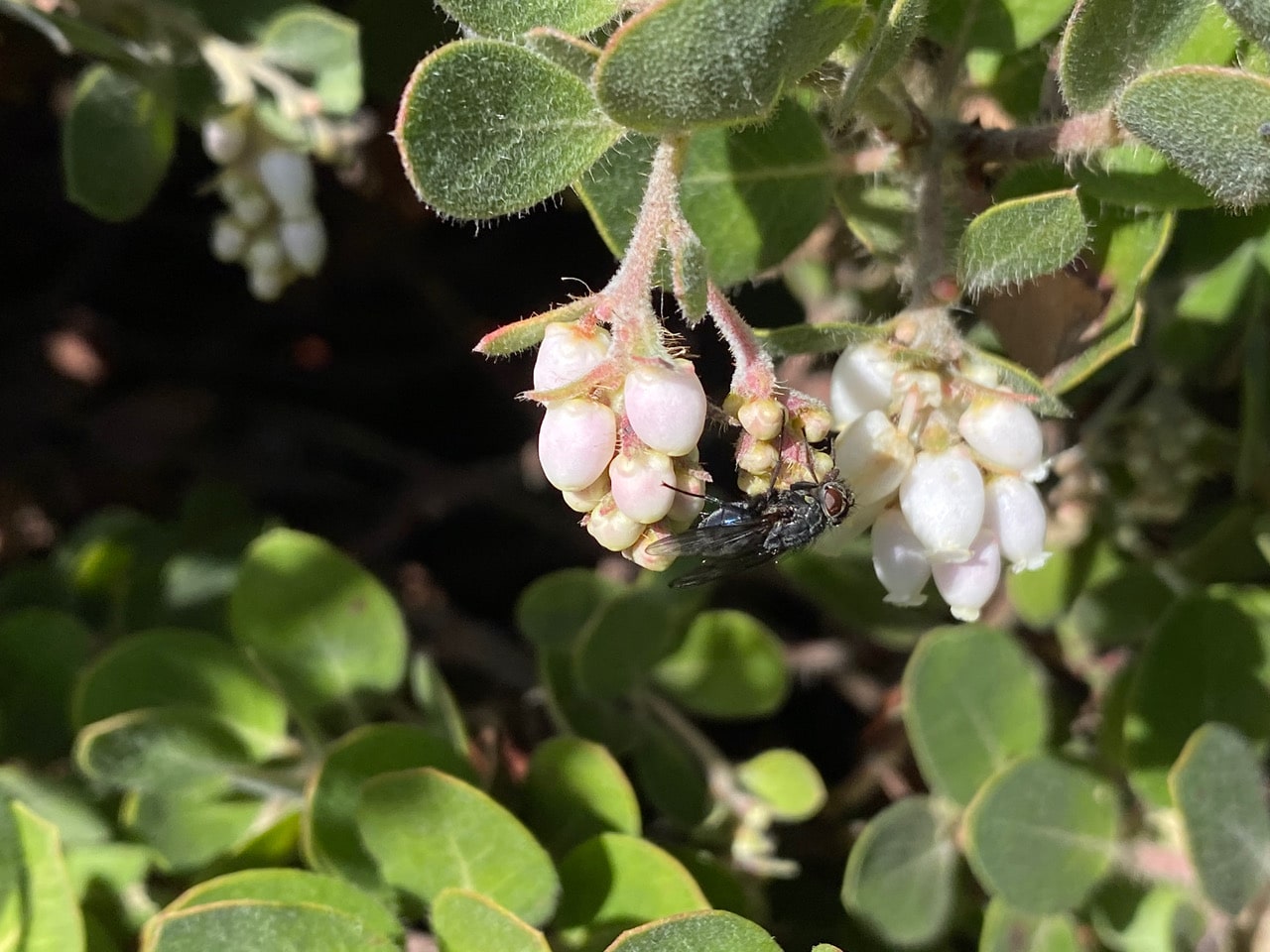 As the day warms up, more and more insects appear on the plants. An unidentified fly rummages through some Manzanita flower buds.