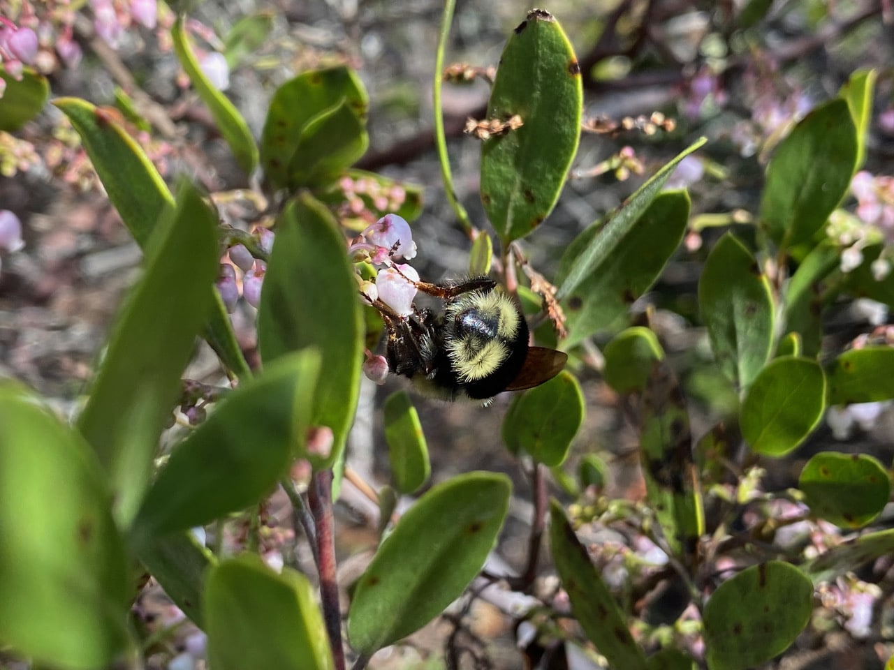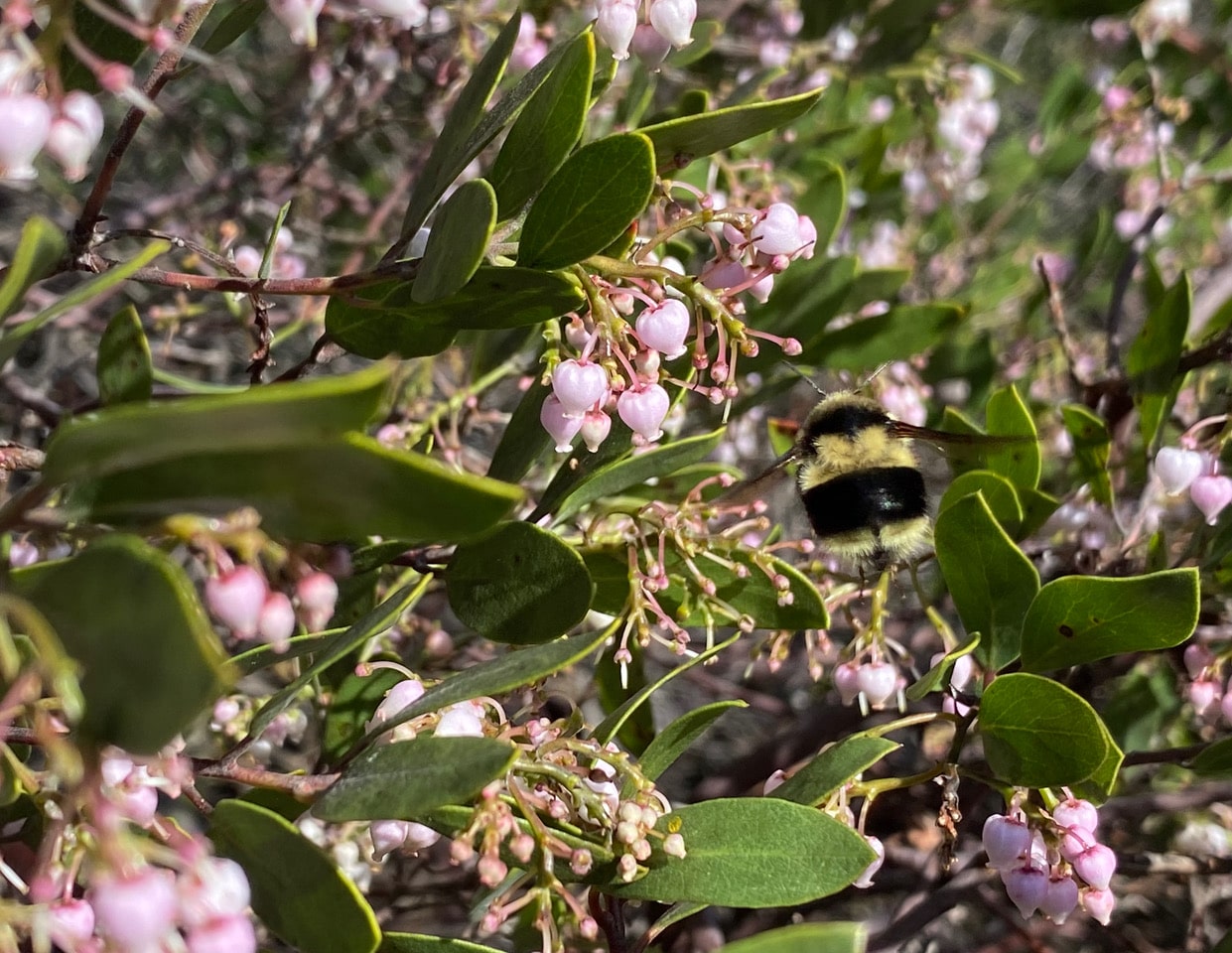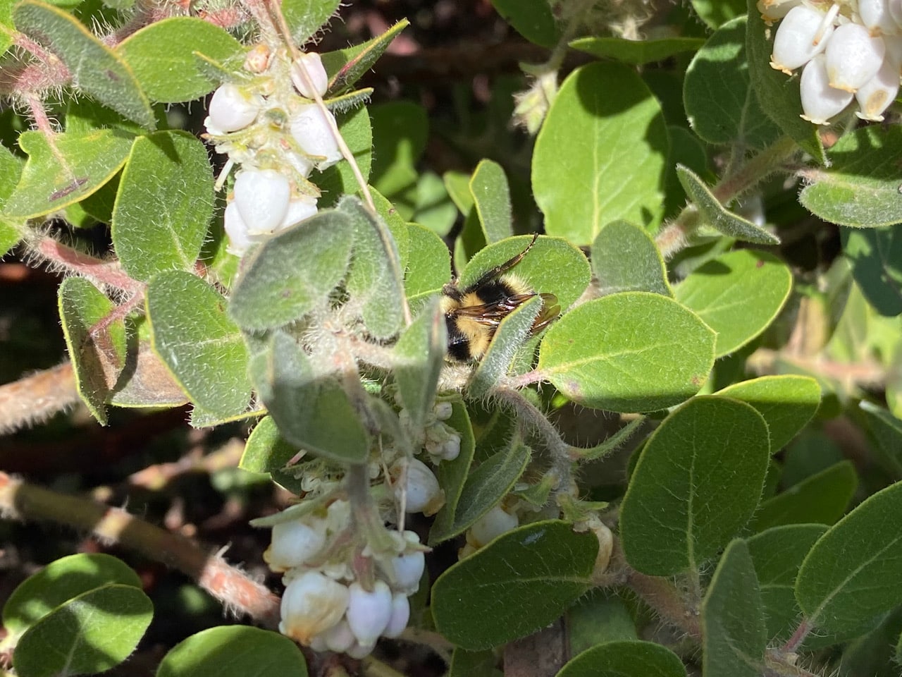 A large Black-tailed Bumble Bee, Bombus melanopygus (family Apidae) lands on a Manzanita leaf and quietly hunkers down without moving. Is the queen taking a break from foraging? Many queen bumble bees are out this time of year, freshly awakened from their hibernation. They are the only members of their colony that have survived winter. They have mated last fall and are set for reproduction. Their first order of business however is to nourish themselves, find a good nest site (usually an abandoned rodent burrow), and then lay eggs. The queen nurtures her first brood of offspring all by herself, foraging for them, and keeping them warm in cold weather by shivering to generate heat. Once the first batch of workers is produced, the queen stays back at the nest to concentrate on laying eggs. Hence forth, the workers take on hive duties, brood care, and foraging.