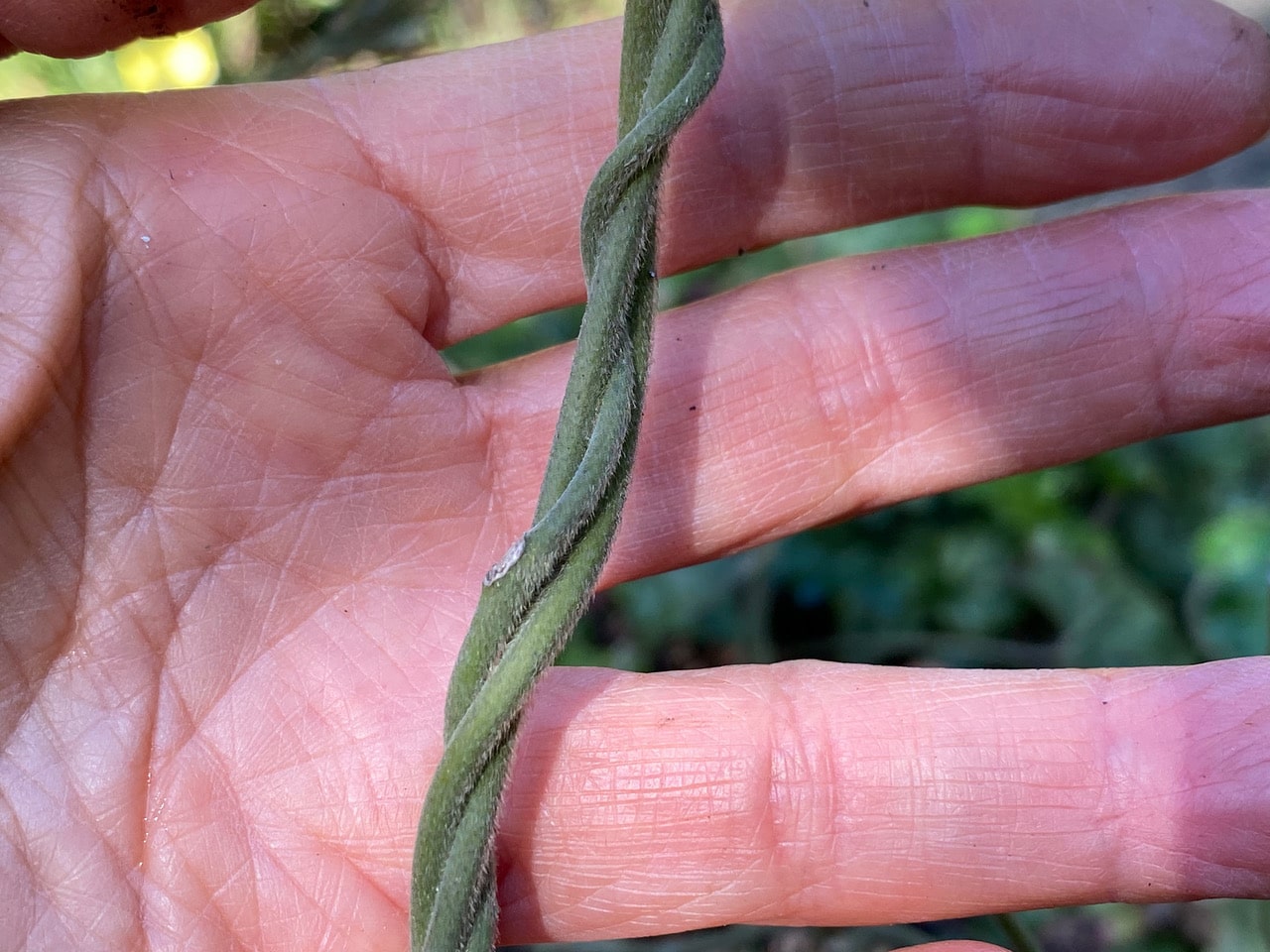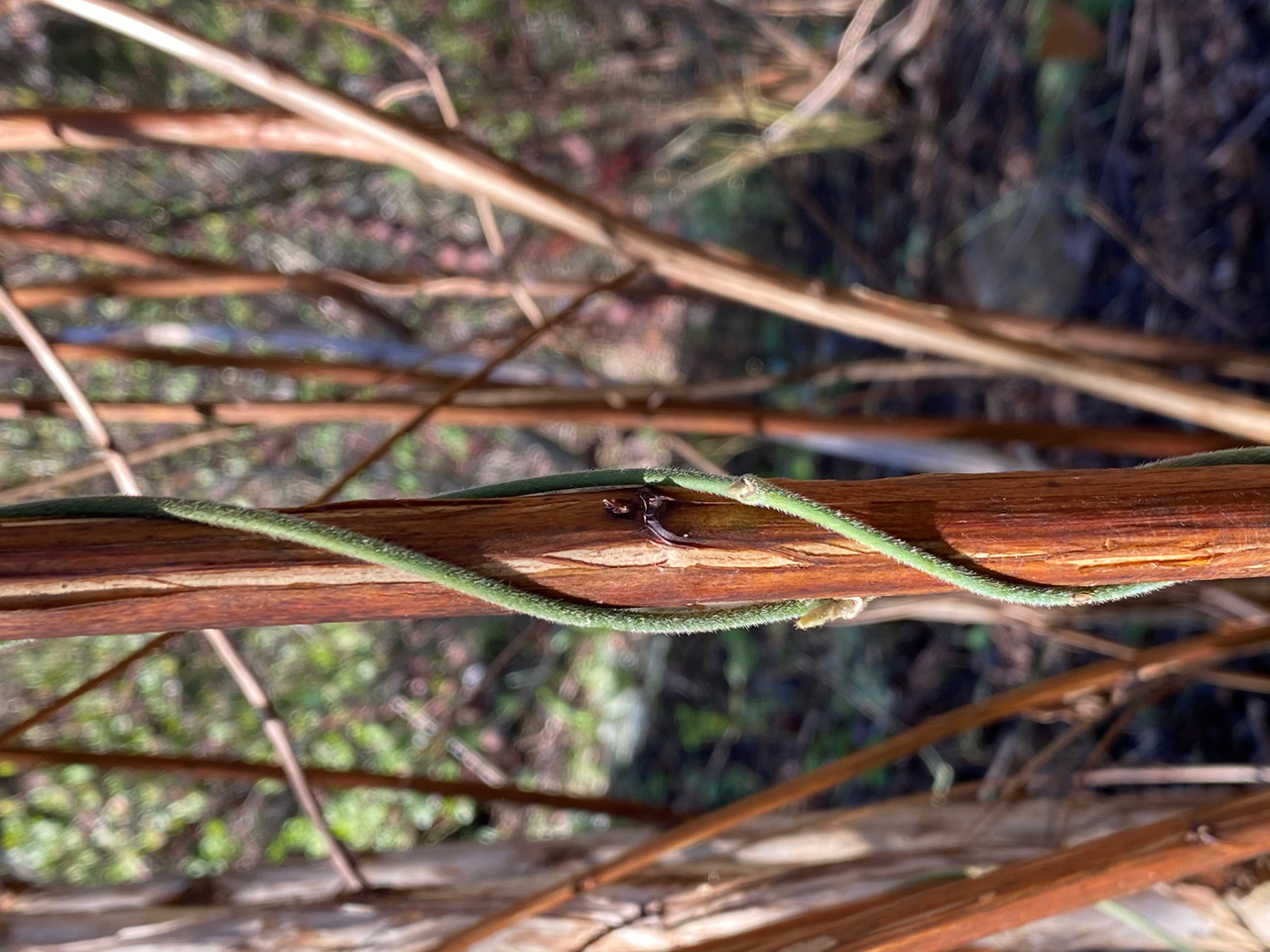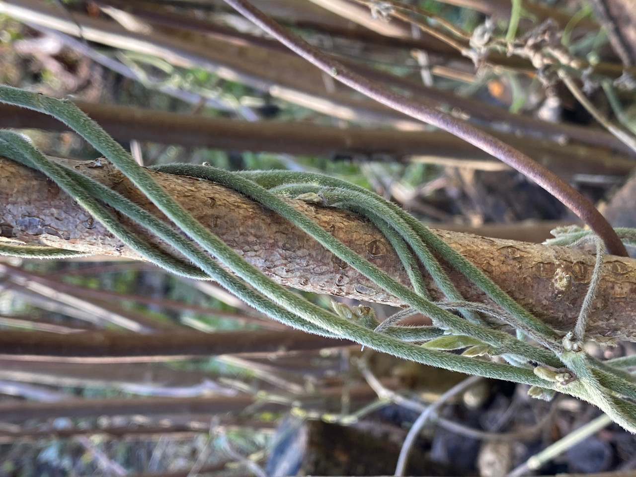 This young California Pipevine already has a secure hold on a supporting shrub. You can see buds emerging from the nodes of the vine.