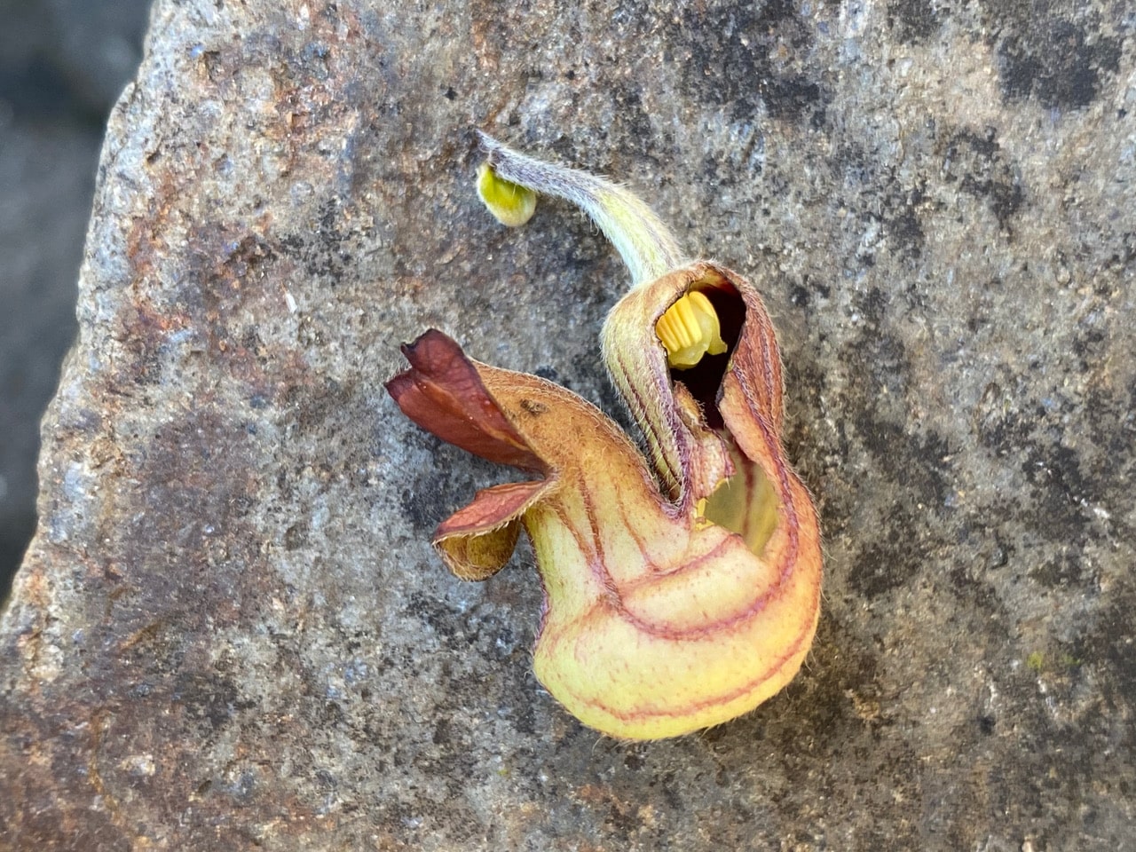 I pick the more mature flower, hoping that I’m not breaking any rules here in the garden. The flower is old and damaged, and not likely to produce a fruit. I lay it on a rock to assess the damage through the irregular gaping hole. Note the yellow structure at the base of the flower (which is on the top end of the pipe-shaped flower as seen here). That consists of anthers embracing a large stigma in the center. The inner wall of the flower surrounding the reproductive structures is a deep maroon color, distinct from the rest of the interior. This colored tissue usually looks wet and grainy; it is where nectar is produced. Whoever (insect? bird?) broke into the flower was probably going after this sweet tissue!