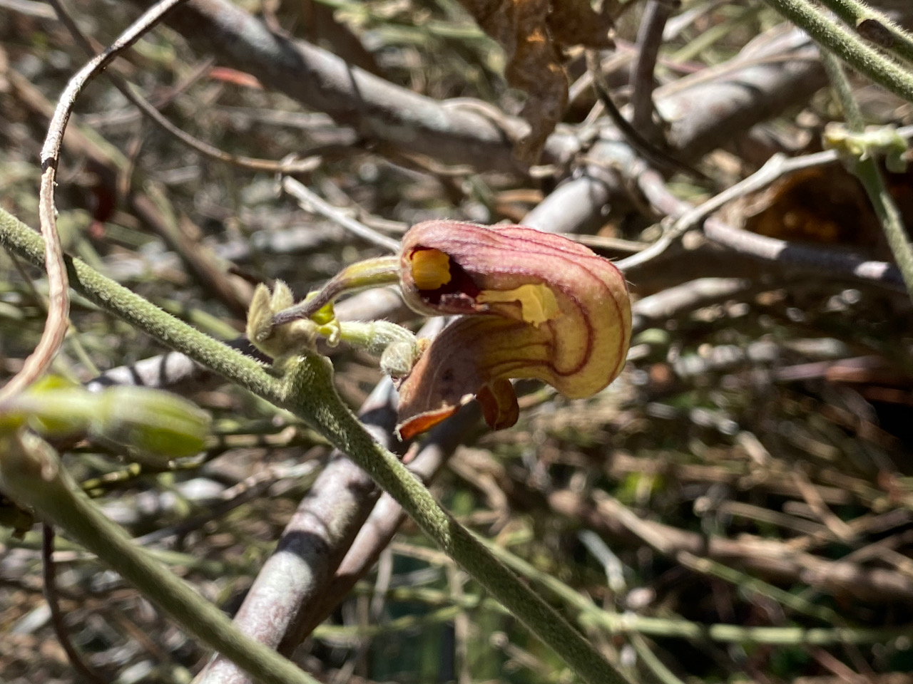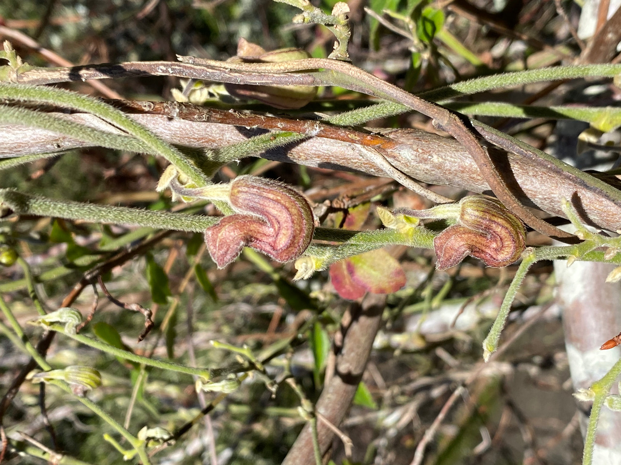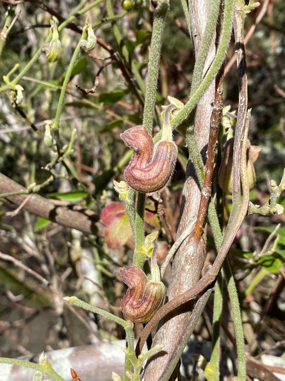 I wind my way to the grove of shrubs that support a healthy stand of California Pipevine, Aristolochia californica. It is too early in the season. Most of the vines emerging from the ground are still trying to establish themselves on neighboring shrubs. There are some flowers, but they are small and not fully opened. It is so hard to find these brownish flowers in the midst of the wild tangle.
