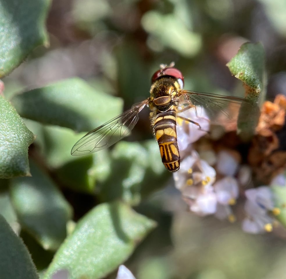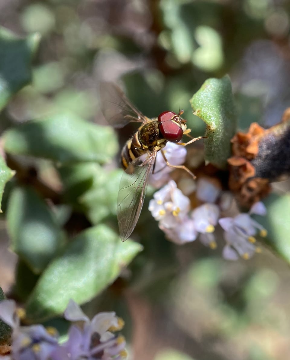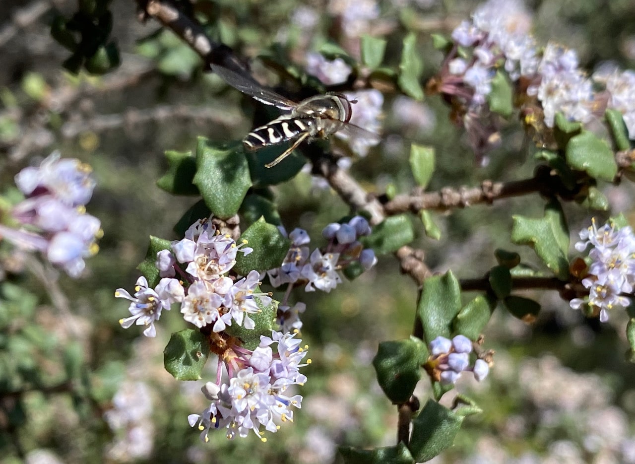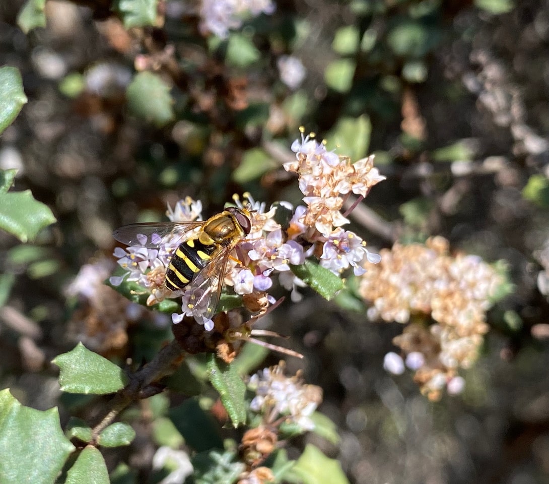 Ooh, another hover fly on the Ceanothus! The Black-margined Flower Fly, Syrphus opinator (family Syrphidae) has been seen a lot lately on many different plants. The species is common in central California during winter months. It can be distinguished from similar species by the abdominal fascia restricted to the sides and isolated from the margins. It is the quintessential hover fly that mimics bees or wasps. The black-and-yellow banding on the abdomen serves to ward off potential predators that want to avoid prey with stings – a form of Batesian mimicry.