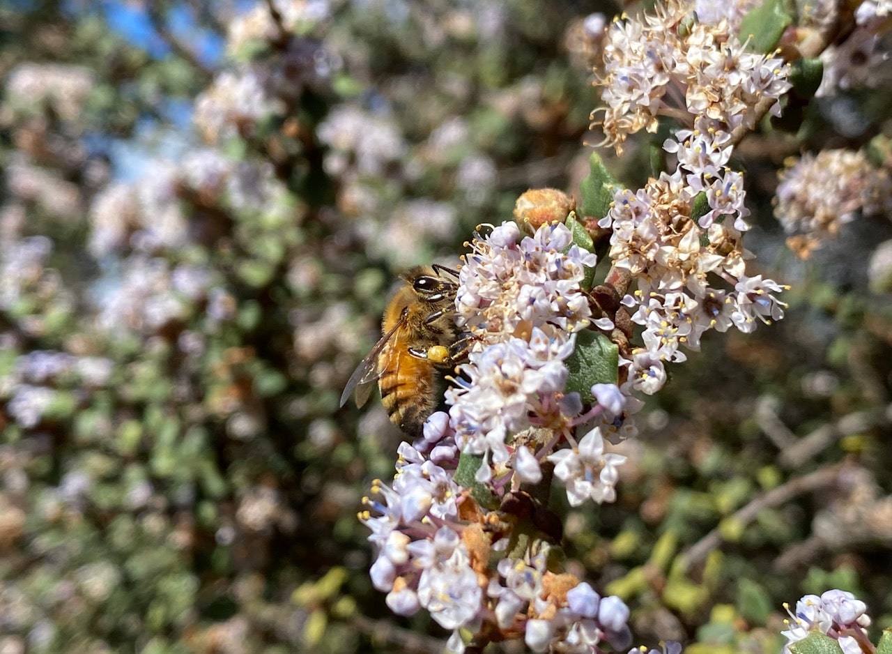 The only bees I see visiting the Ceanothus are a few Honey Bees, Apis mellifera (family Apidae). Maybe it’s because the flowers are past their prime. This worker bee has actually collected some pollen in her pollen basket.