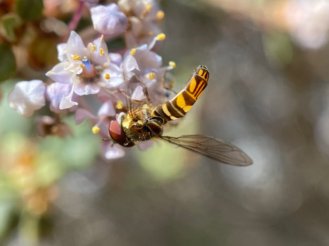 Before I leave the garden, I stop by the blooming Ceanothus near the gate. Much to my delight, the shrub is abuzz with insect activity although the plant is past peak bloom.