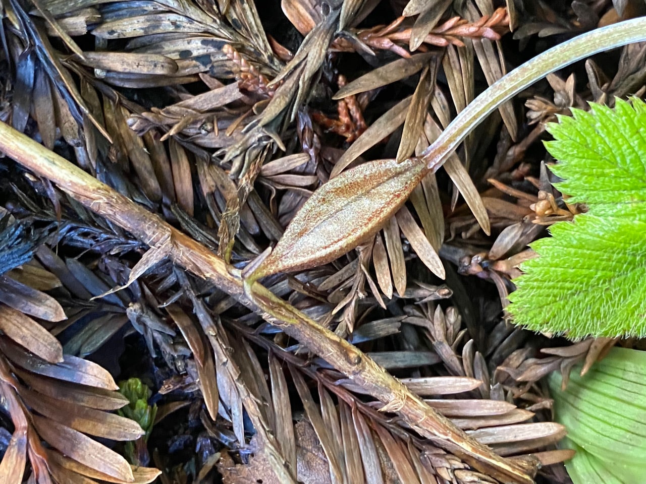 Totally camouflaged, a mature brown seed pod has come to lie on the redwood duff.