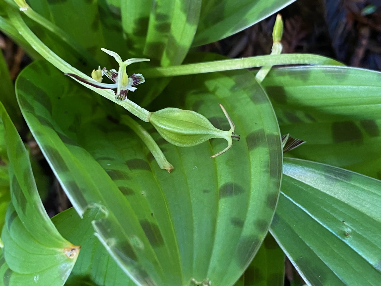 Late, but not too late! My heart misses a beat as I find a single flower of Fetid Adder’s Tongue, Scoliopus bigelovii peeking out from a young plant. This odd lily has striking flowers and handsome leaves.