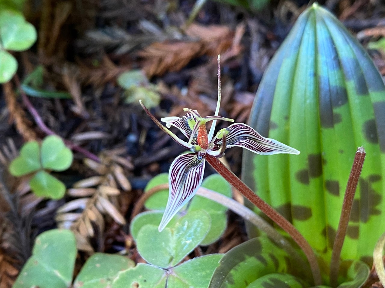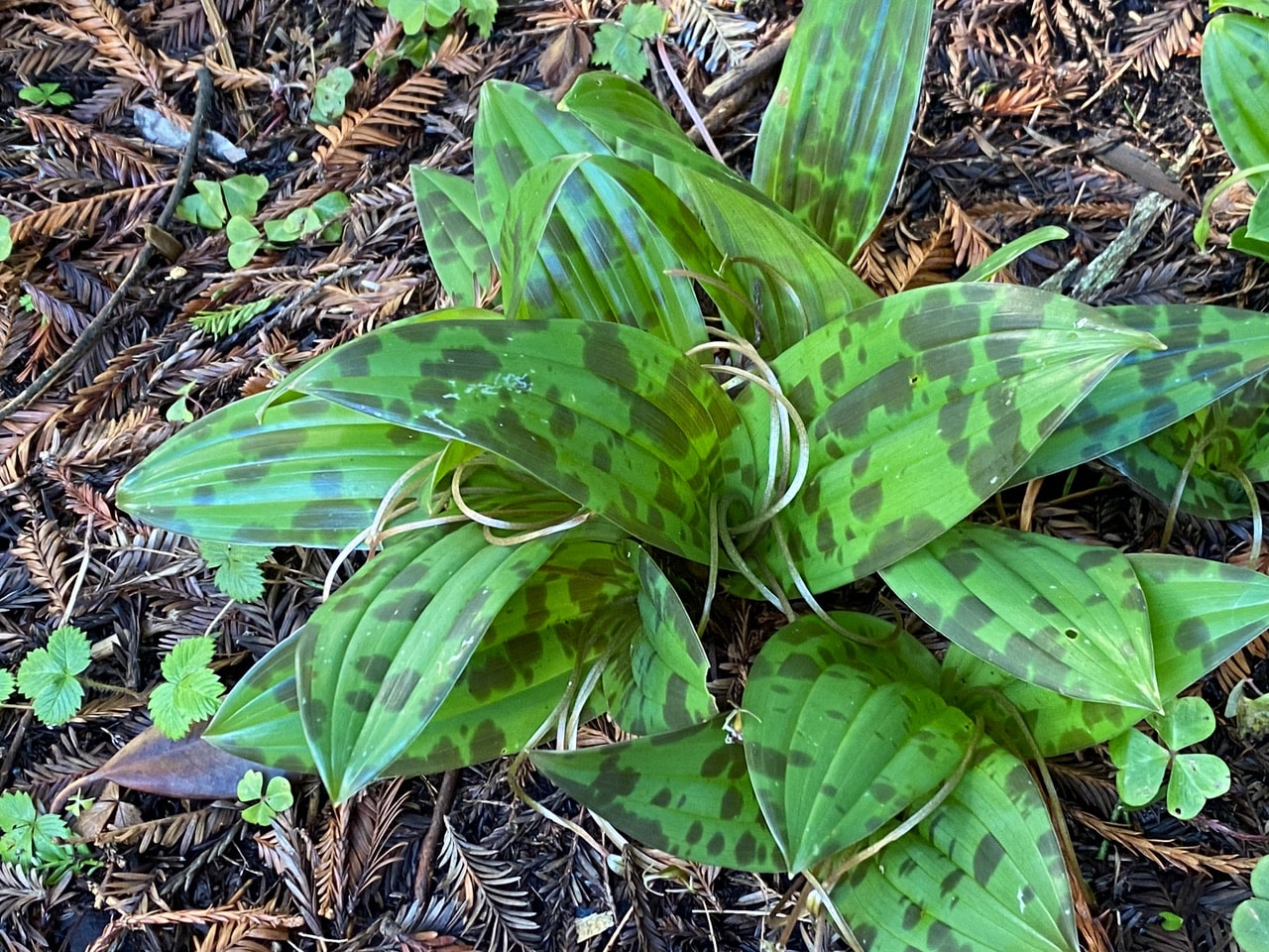 My heart sinks when I finally find the plant I was looking for under the redwoods. The bright green, mottled leaves of the Fetid Adder’s Tongue are easy enough to spot, but when the leaves are fully developed, the flowers are mostly gone. Every sinuous flower stalk ends with not a flower, but a developing fruit. Am I too late for the flowers?