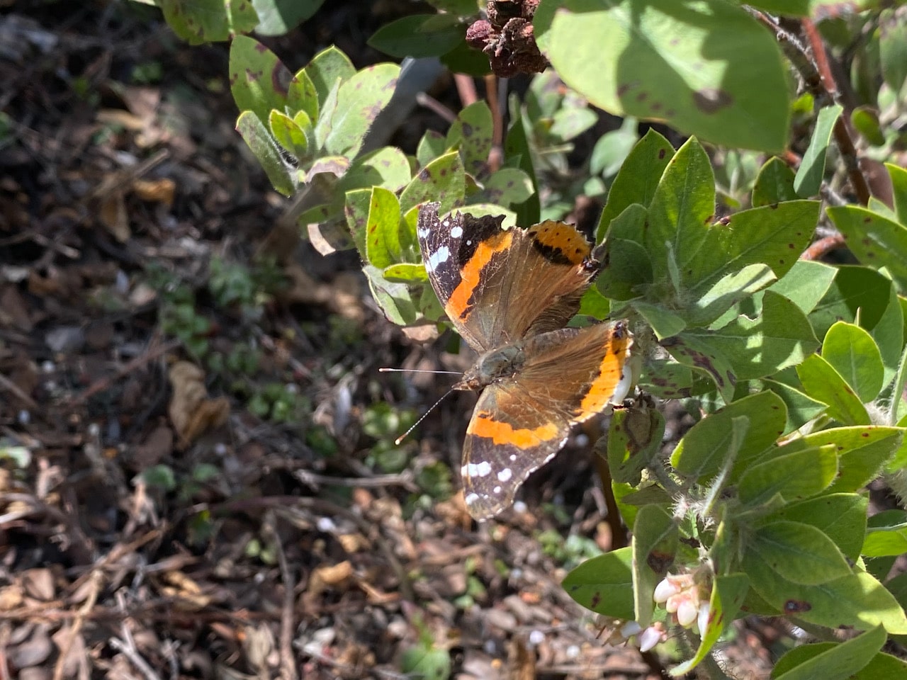 A tattered Red Admiral butterfly lands on a Manzanita to take nectar from the flowers. Its faded wings are worn and tattered on the edges. How did it manage to survive the rain storm and bomb cyclone we just experienced?
