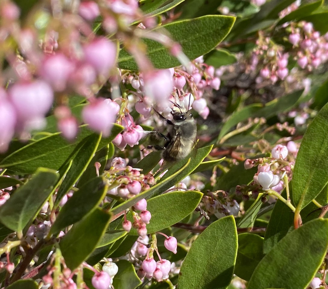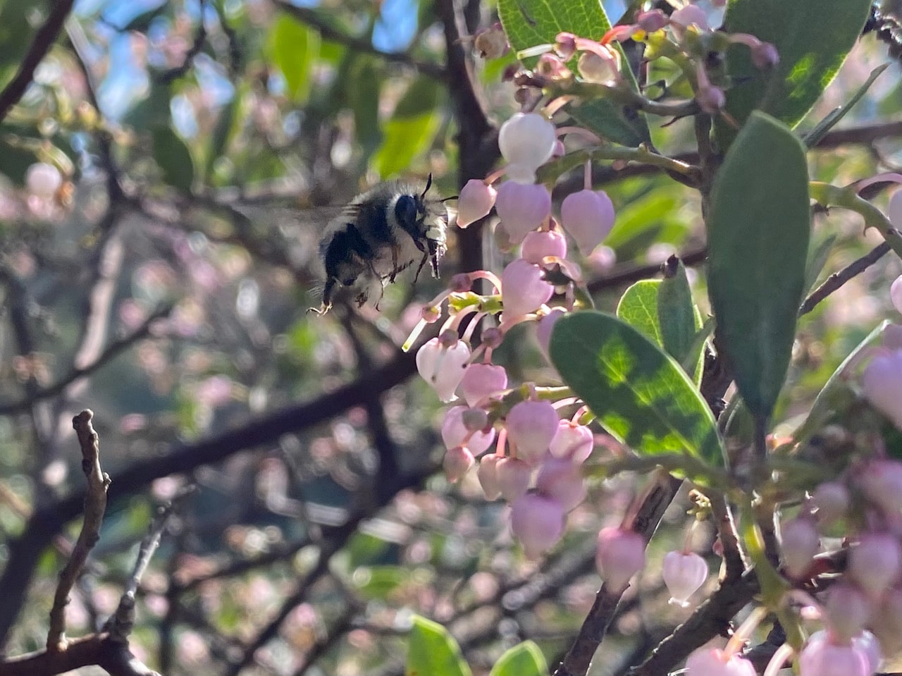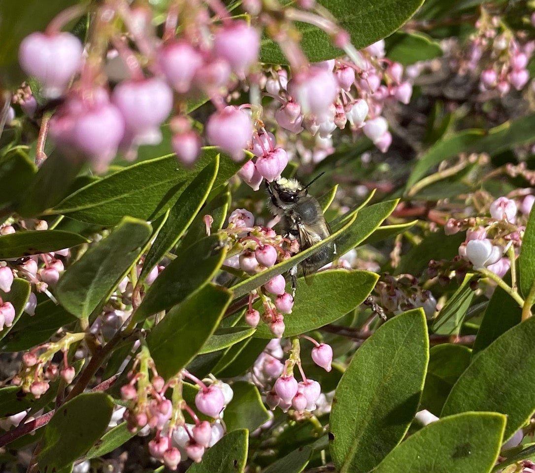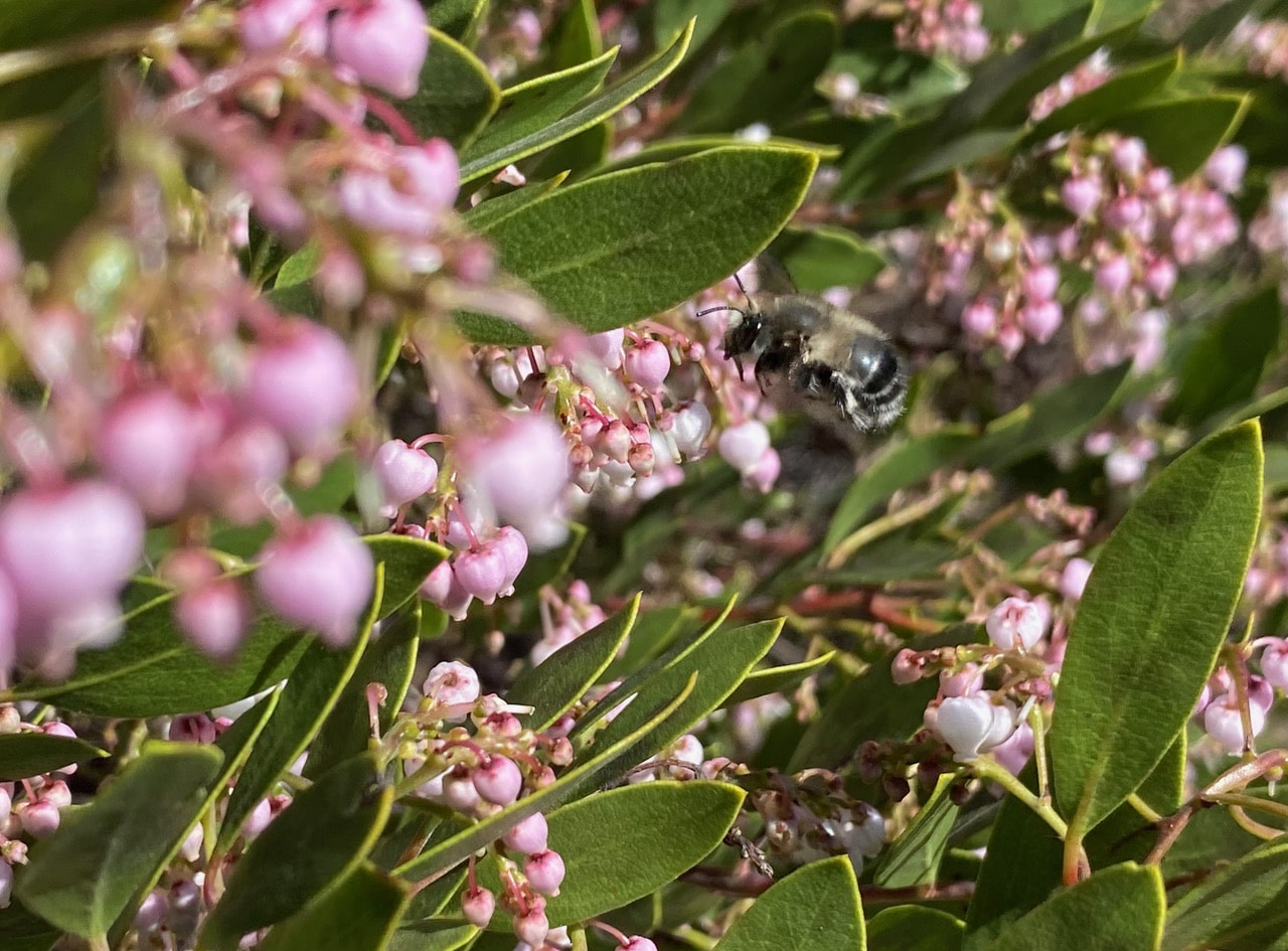 More numerous than the bumble bees at the blooming Manzanita are these gray, stout-bodied bees that fly around noisily. They are the California Mountain-Digger Bees, Habropoda depressa (family Apidae). Interestingly none of them seems to be collecting pollen. They are all sticking their tongues into the flowers to access nectar. Then I realize that they are mostly males – males do not gather pollen to provision the nest, neither do they have the equipment (scopae or special pollen collecting hairs on the hind legs) for the job.