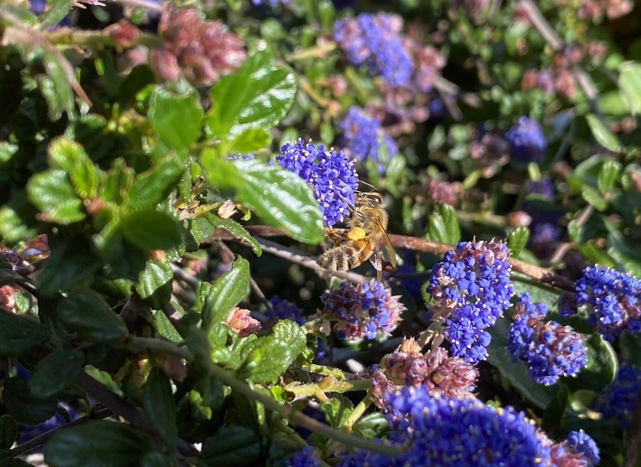 The blooming Ceanothus is much loved by the Honey Bees, Apis mellifera (family Apidae). The workers are carrying large loads of pollen. The fragrant flowers also attract some bumble bees, but not in the numbers I would expect this time of year.