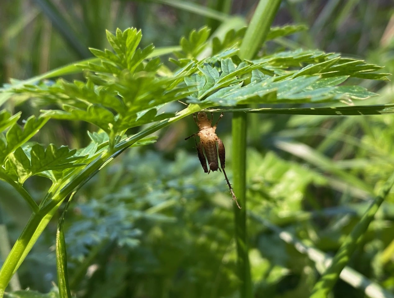 Who’s that insect hanging on a grass blade under a Poison Hemlock leaf?