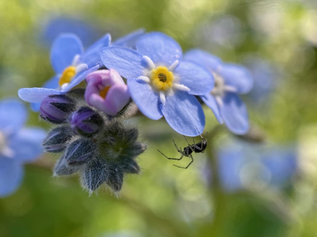A Cobweb Spider hangs under a cluster of Forget-me-not flowers, Myosotis sp., spinning its tangled web.