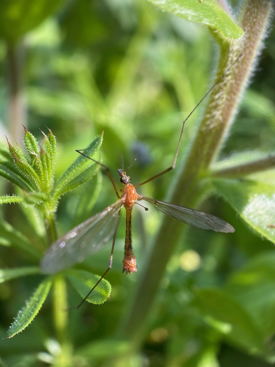A Large Crane Fly (family Tipulidae) lands clumsily on a bedstraw. Gee, what happened to the fly – it only has 3 of its 6 legs, and only one of the two halteres! Note the lollipop-like structure under its right wing. That’s a haltere, the club-shaped organ that is modified second pair of wings of a Diptera (flies), and serves to maintain balance in flight.