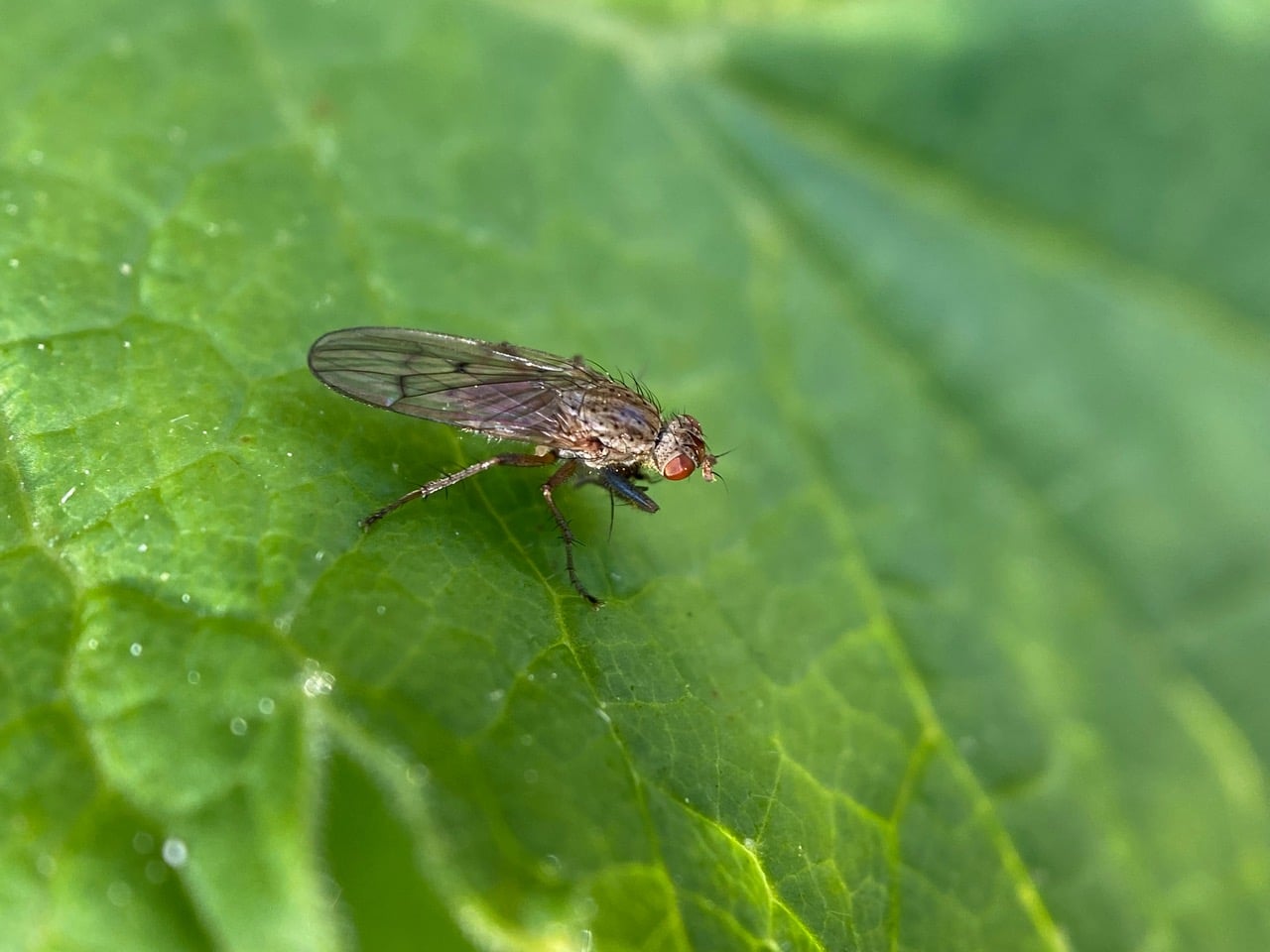 A fly lands on a leaf, seeming to be holding something in its blue front legs.