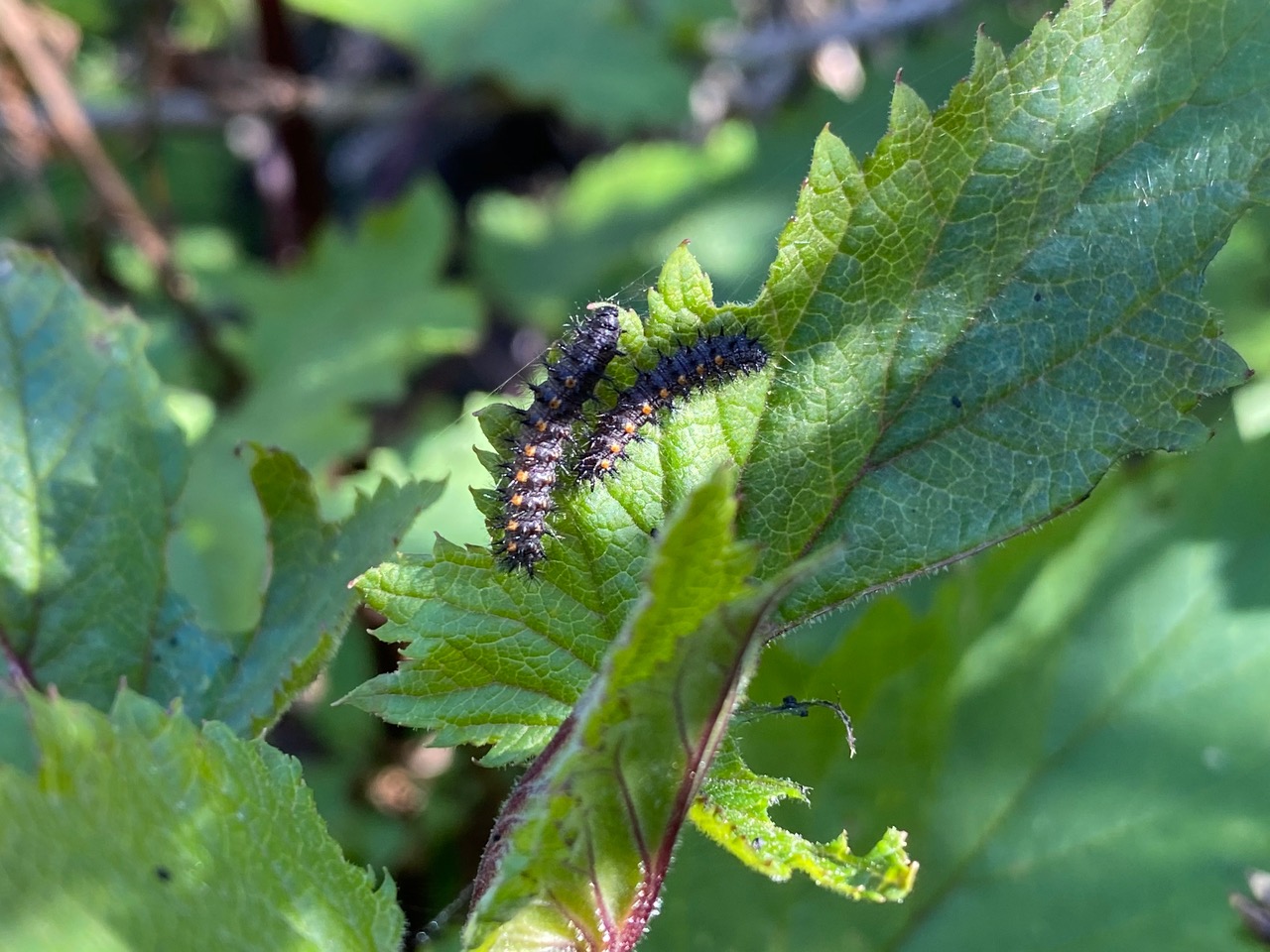 Ah, here are two caterpillars together. Is the larger one spinning silk?