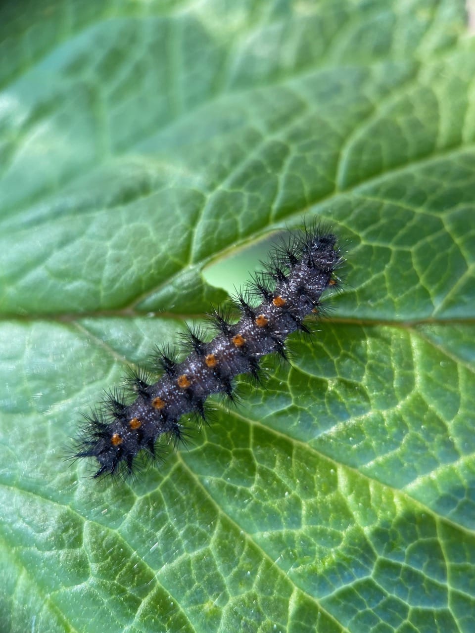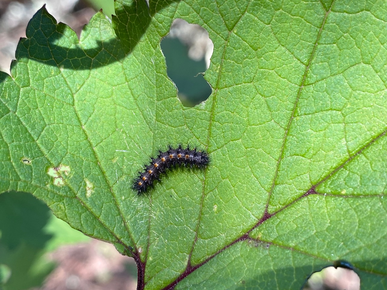 This caterpillar has nibbled on the edge of the tender leaf, and left little pellets of frass (insect poop) below it. Most accounts of the life cycle of the species tell that the young caterpillars tend to feed in aggregation, but I am seeing about a dozen of them, all feeding solo, each on its own leaf. Perhaps they have yet to find each other, or maybe they feed solo after hibernation?