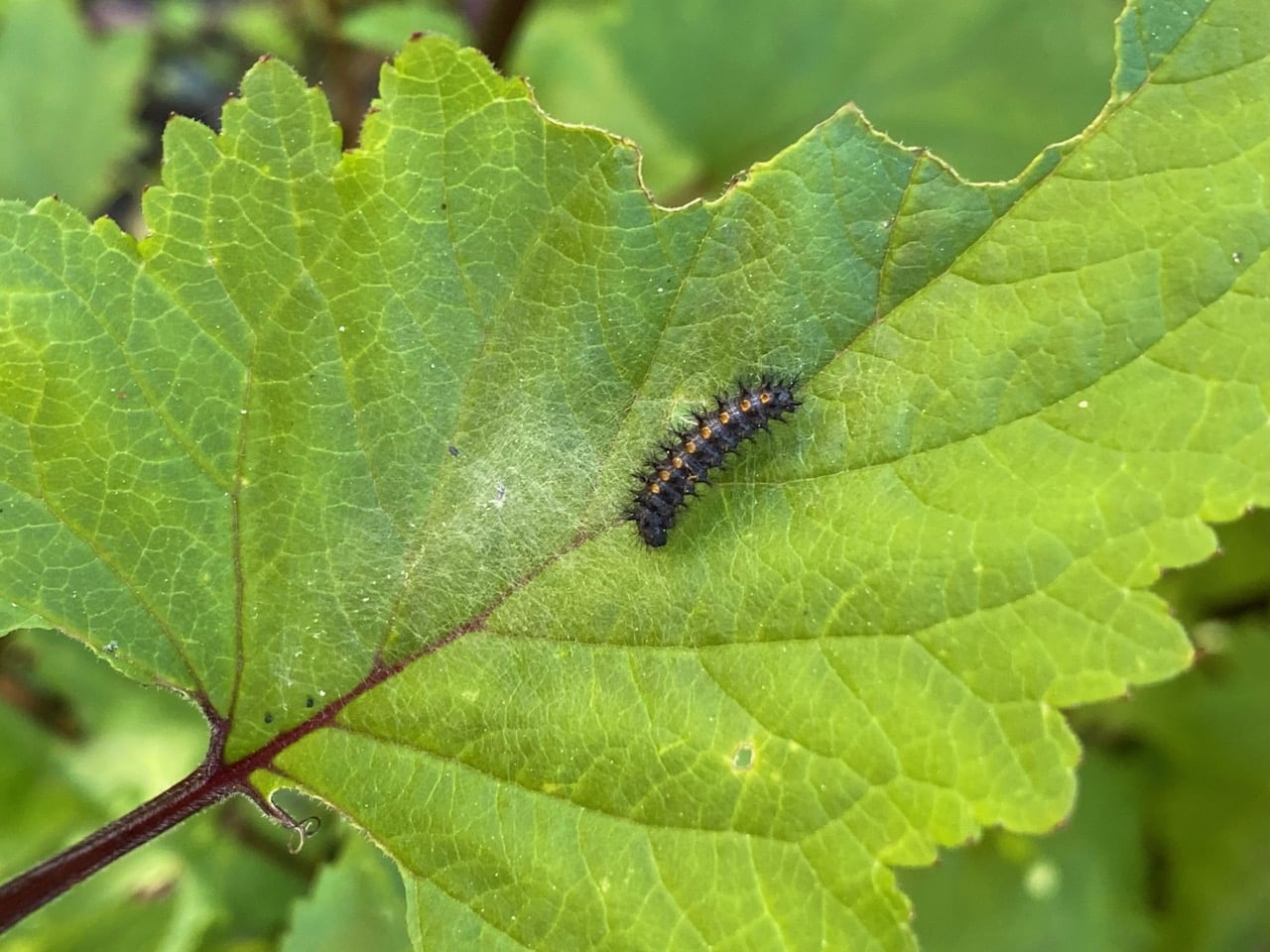 Here’s another one. The silk is more visible on this leaf. It blows my mind to think that the tiny caterpillar has been in diapause (insect version of hibernation) in the leaf litter or under a rock through the winter, and has now woken up to continue its life cycle on the host plant.