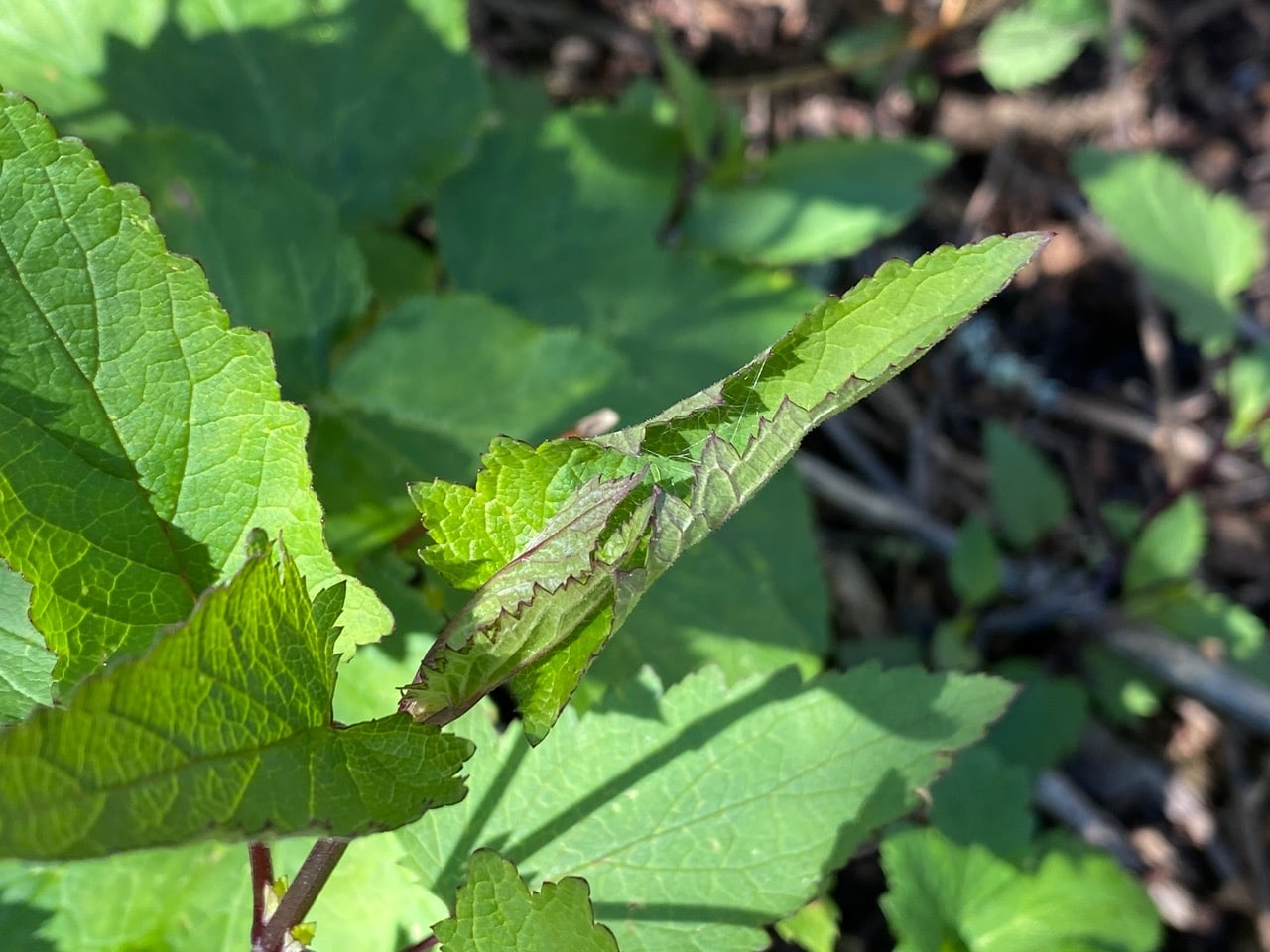 The terminal leaves of this Bee Plant have been tied together with silk. The work of a spider? Or caterpillar? I peek through the open end, but don’t see any occupant.