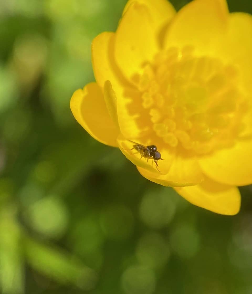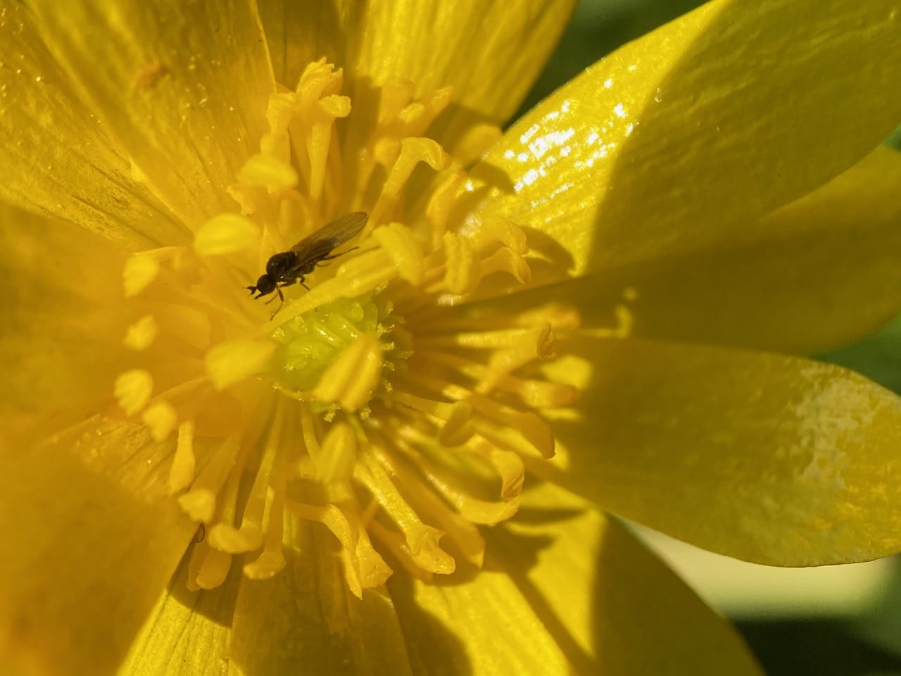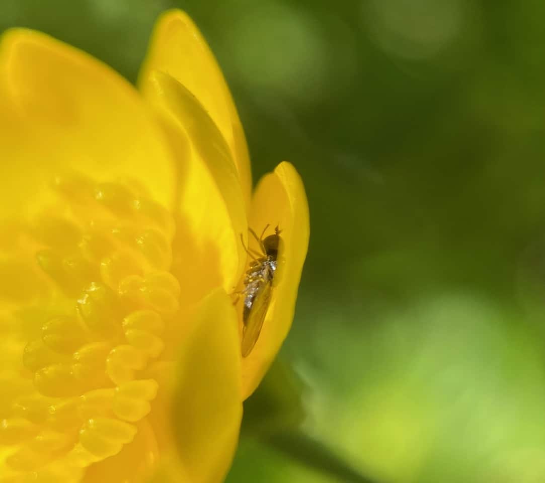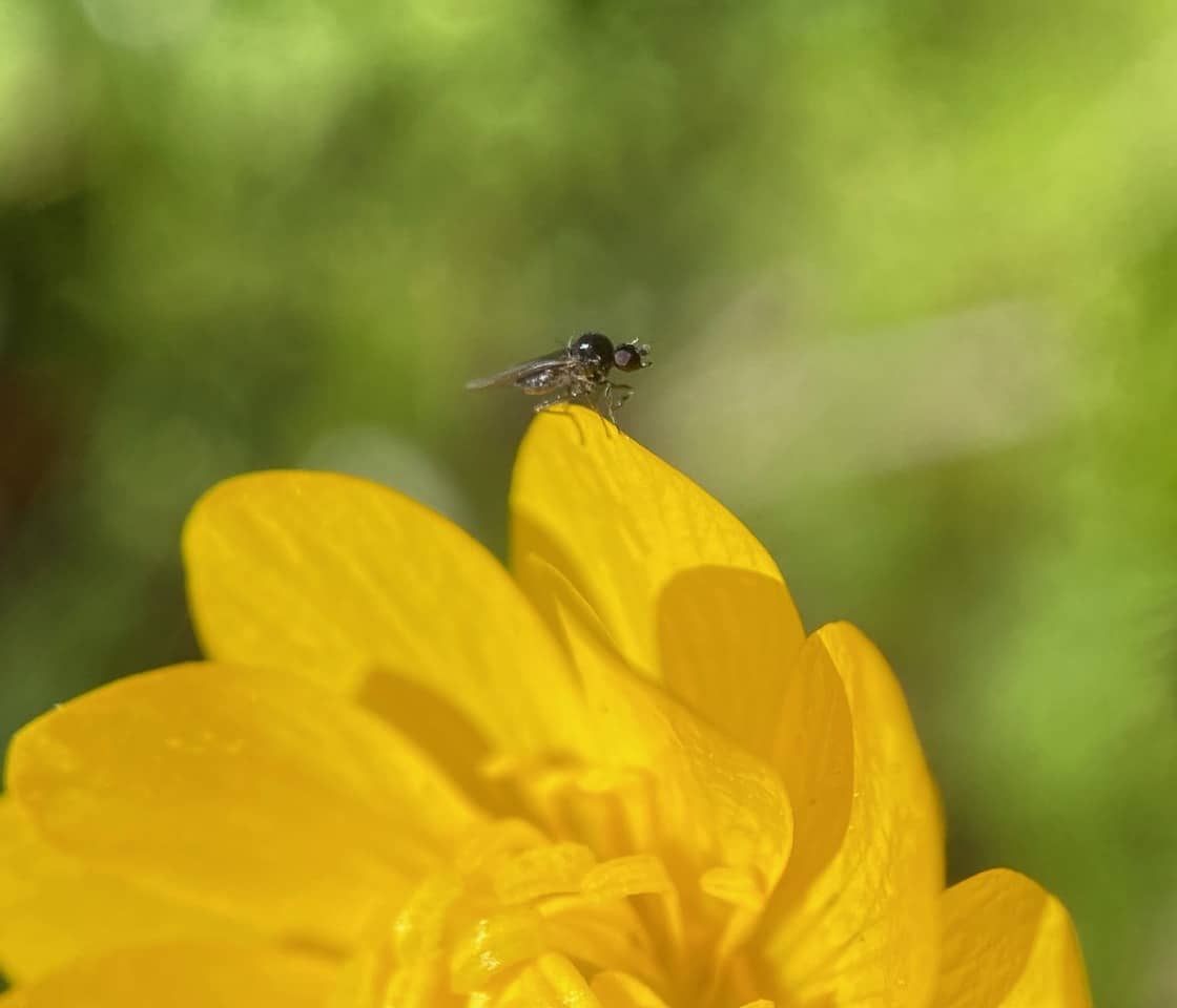This one crawls out of a flower with pollen grains stuck on its body and wings. Tiny as these flies are, they are probably capable of transferring pollen between the buttercup flowers and effectively pollinating them.