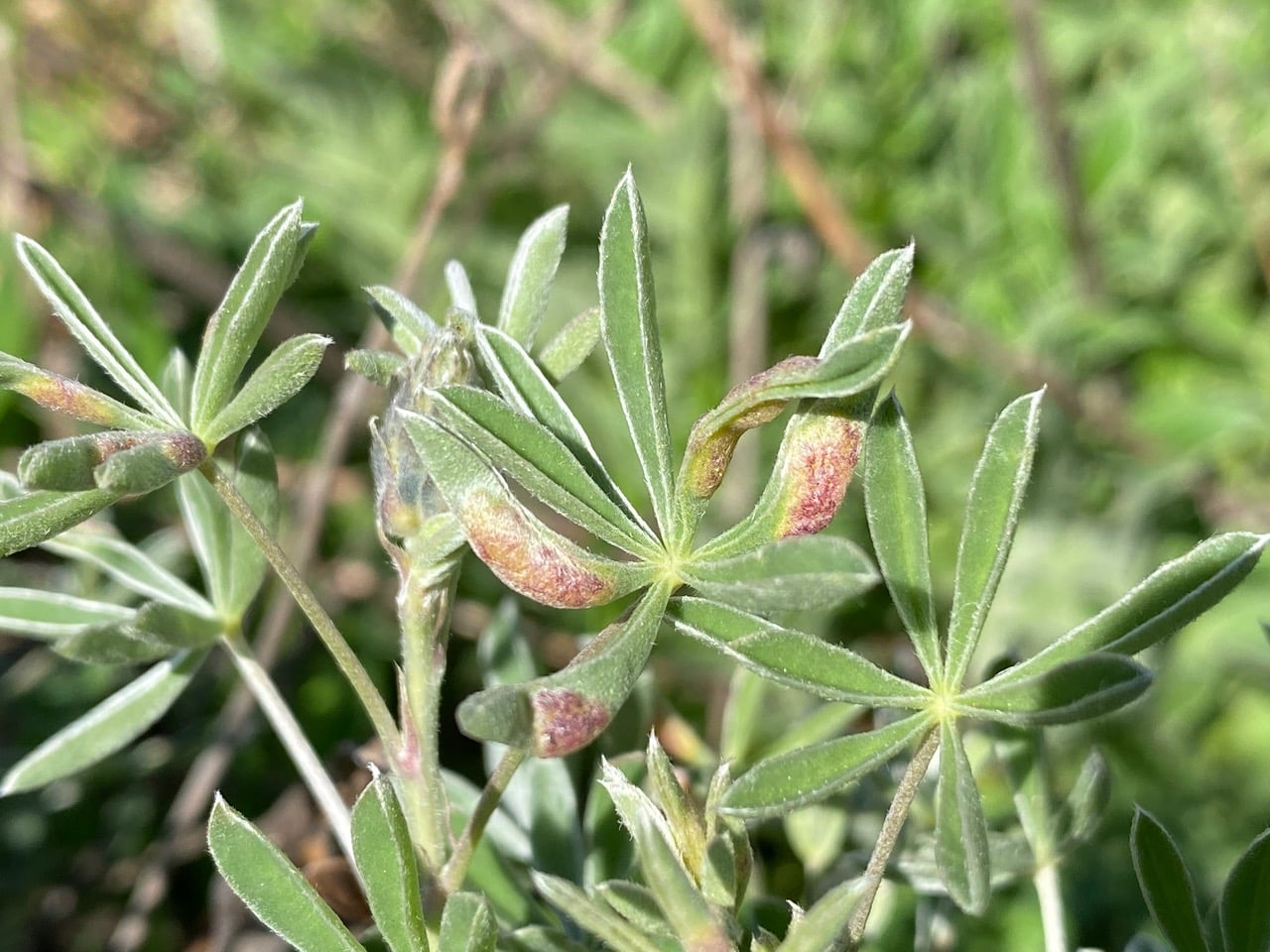 The Silverleaf Lupine, Lupinus albifrons at the entrance are not yet in bloom. Instead I notice numerous reddish swellings on the leaflets that are folded along the midrib. These tumor-like growths are induced by the Leaf-fold-gall Midge, Dasineura lupinorum, family Cecidomyiidae. Females lay their eggs on unopened leaflets in growing buds. Newly hatched larvae crawl between the closed halves of the leaflets and begin feeding, stimulating formation of the swollen galls. The larvae complete development inside the gall and remain there through pupation. The midge produces several generations per year.
