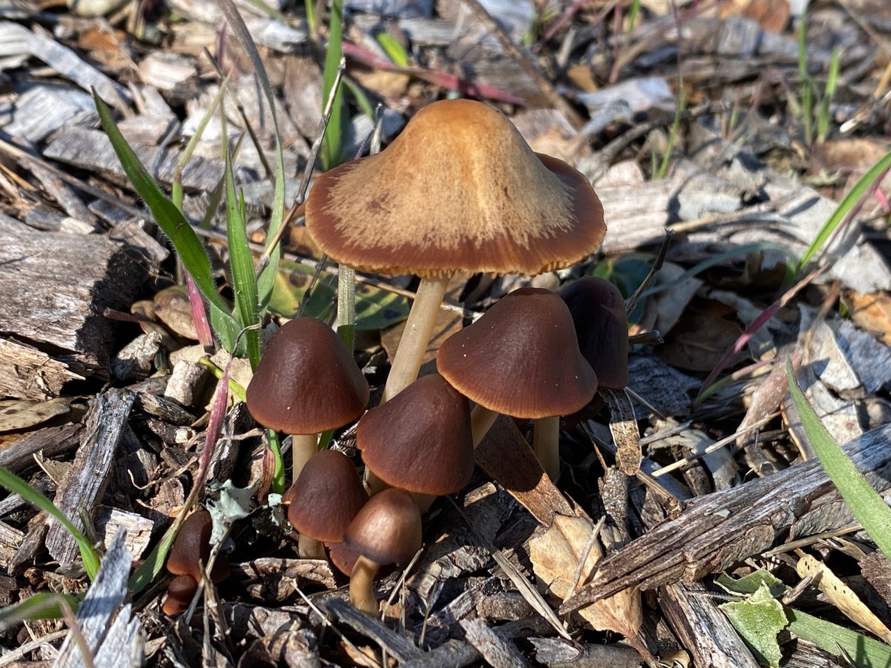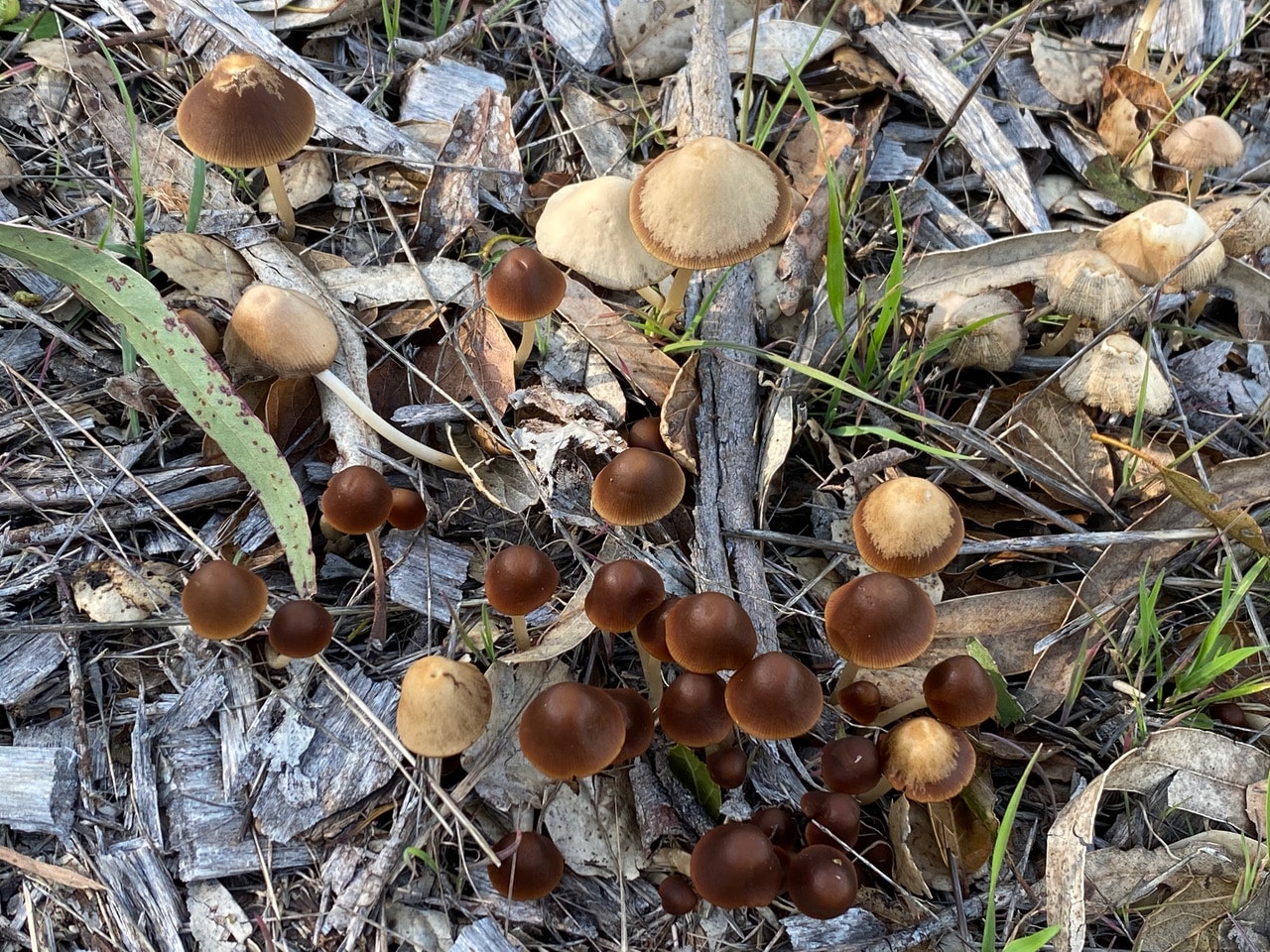 A massive crop of little brown mushrooms have sprouted from the old wood chip mulch along the road. I think these belong to the genus Psathyrella.