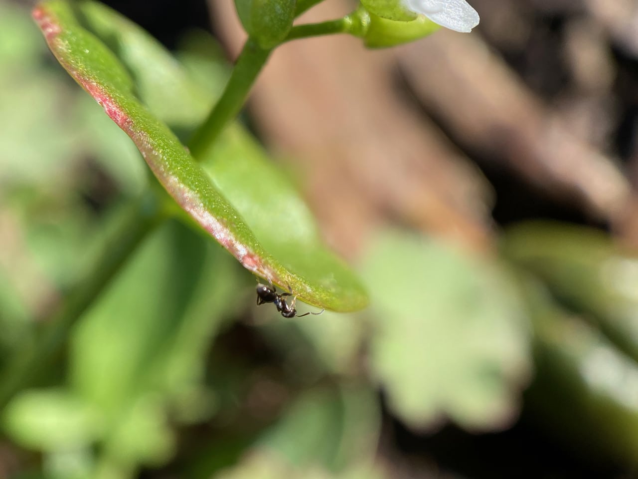 Interestingly, the ant descends from the flower and runs around the rim of the circular leaf three time in a fast pace. Is it marking the plant for future reference?