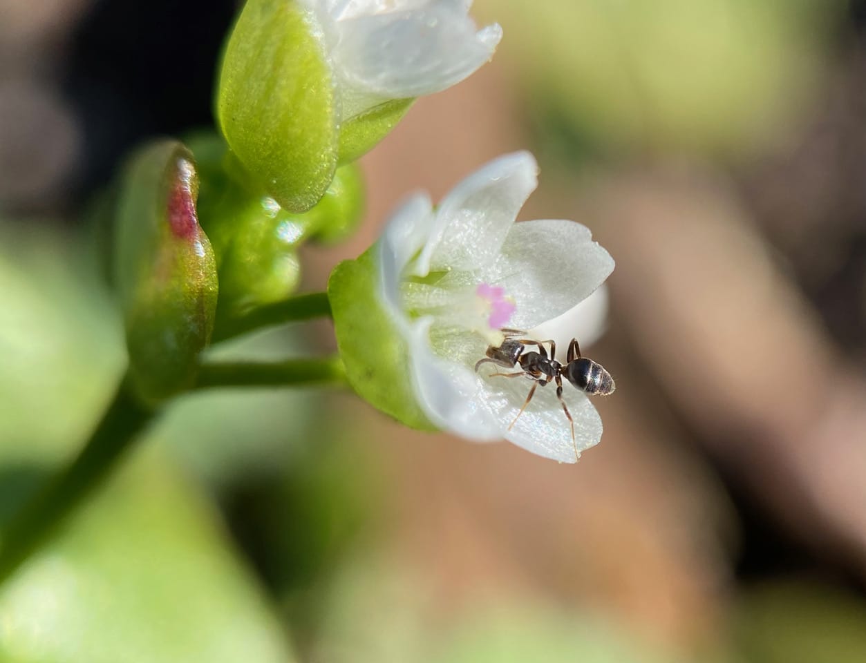 After a long while the ant emerges and crawls over the flower’s reproductive parts. The insect can certainly be an agent for pollen transfer!