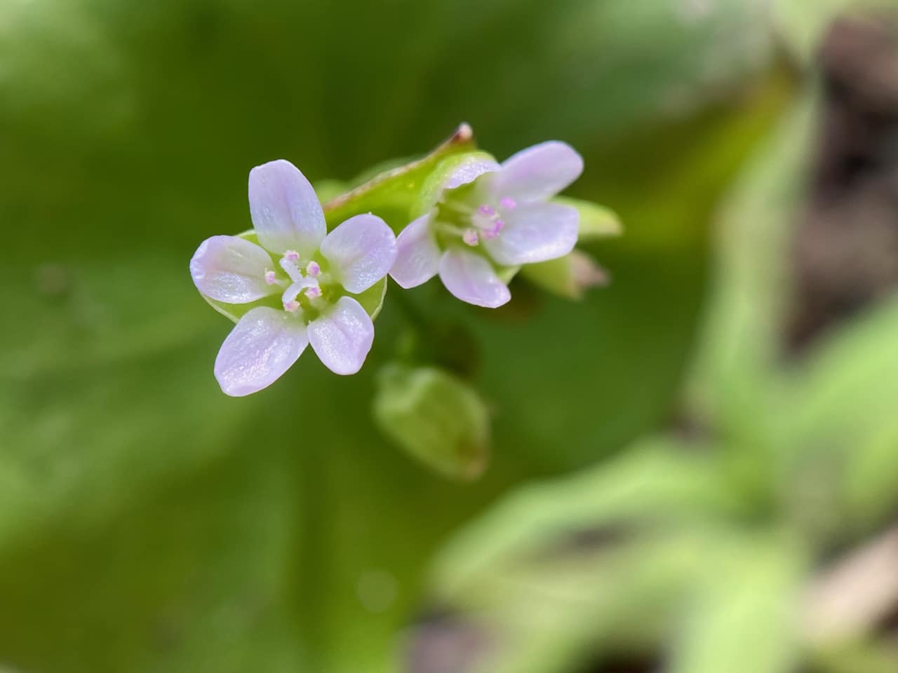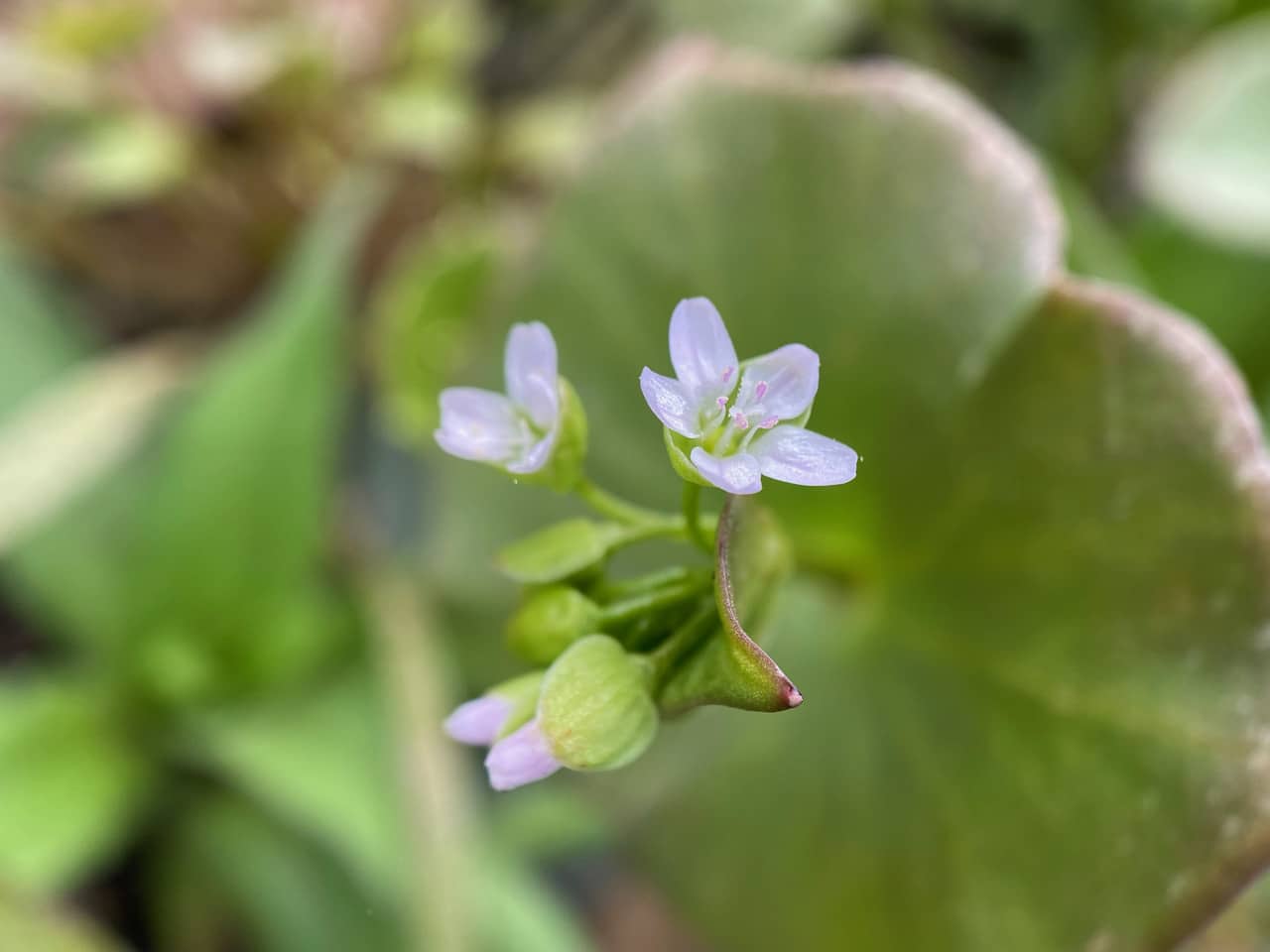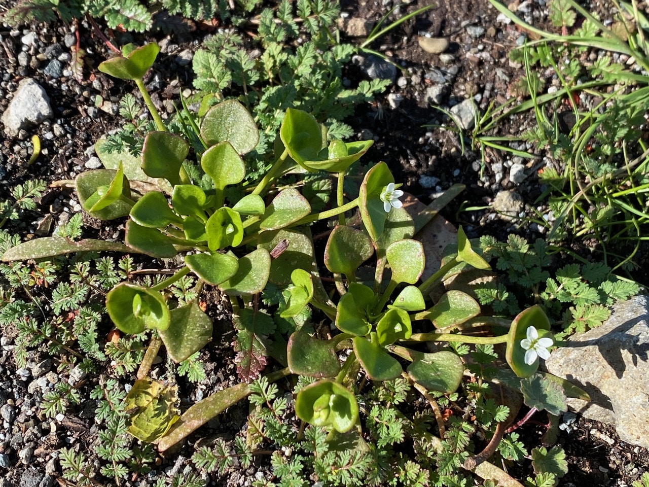 The Miner’s Lettuce, Claytonia perfoliata that grow up here in full sun and wind exposure tend to be diminutive. The flowers grow above a pair of leaves that are fused around the stem to form what looks like a single circular leaf.