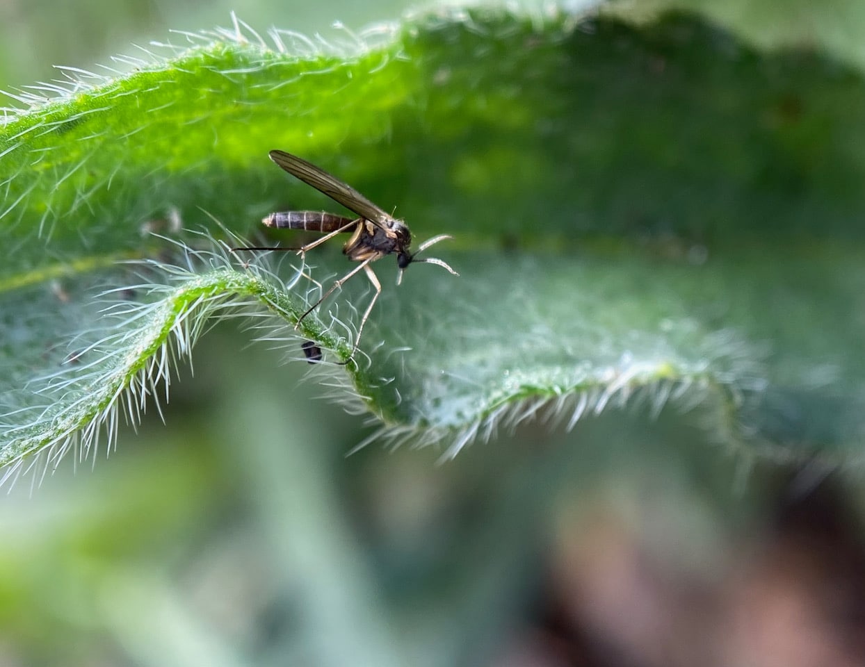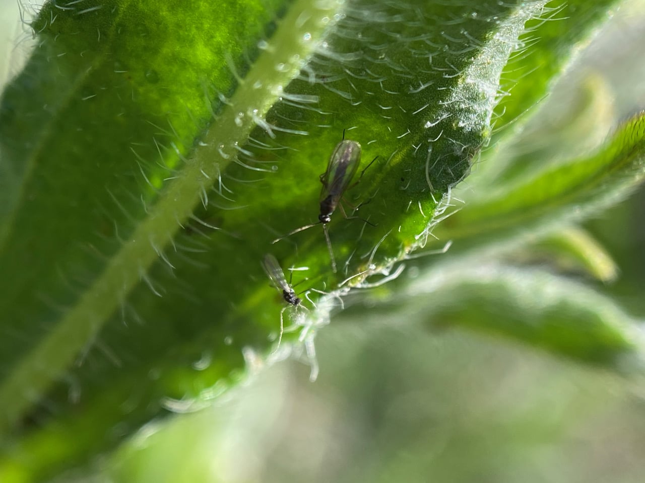 Numerous small flies are moving around in the moist shadowy areas of the lower foliage.