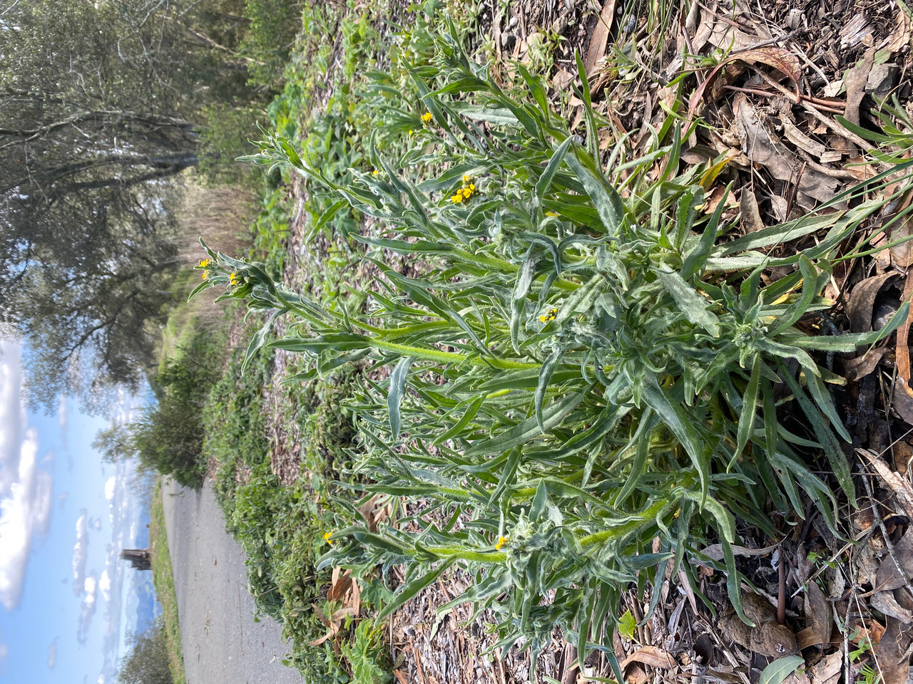 Like other members of the family Boraginaceae, the flowers are coiled in their terminal flowering whorl shaped like a violin or fiddle, hence the name fiddleneck. The five petaled golden yellow funnel-shaped flowers are borne on scorpionoid spikes with leafy bracts at the base. Close-up, the entire plant is rather bristly.