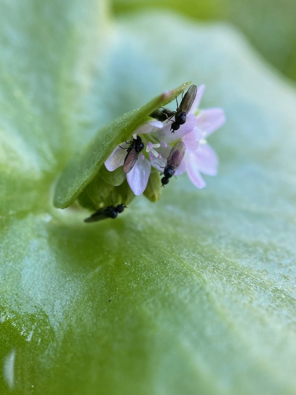 As evening approaches, the Hybotid Dance Flies gather on the Miner’s Lettuce flowers in large numbers. I think this is how they spend the night.