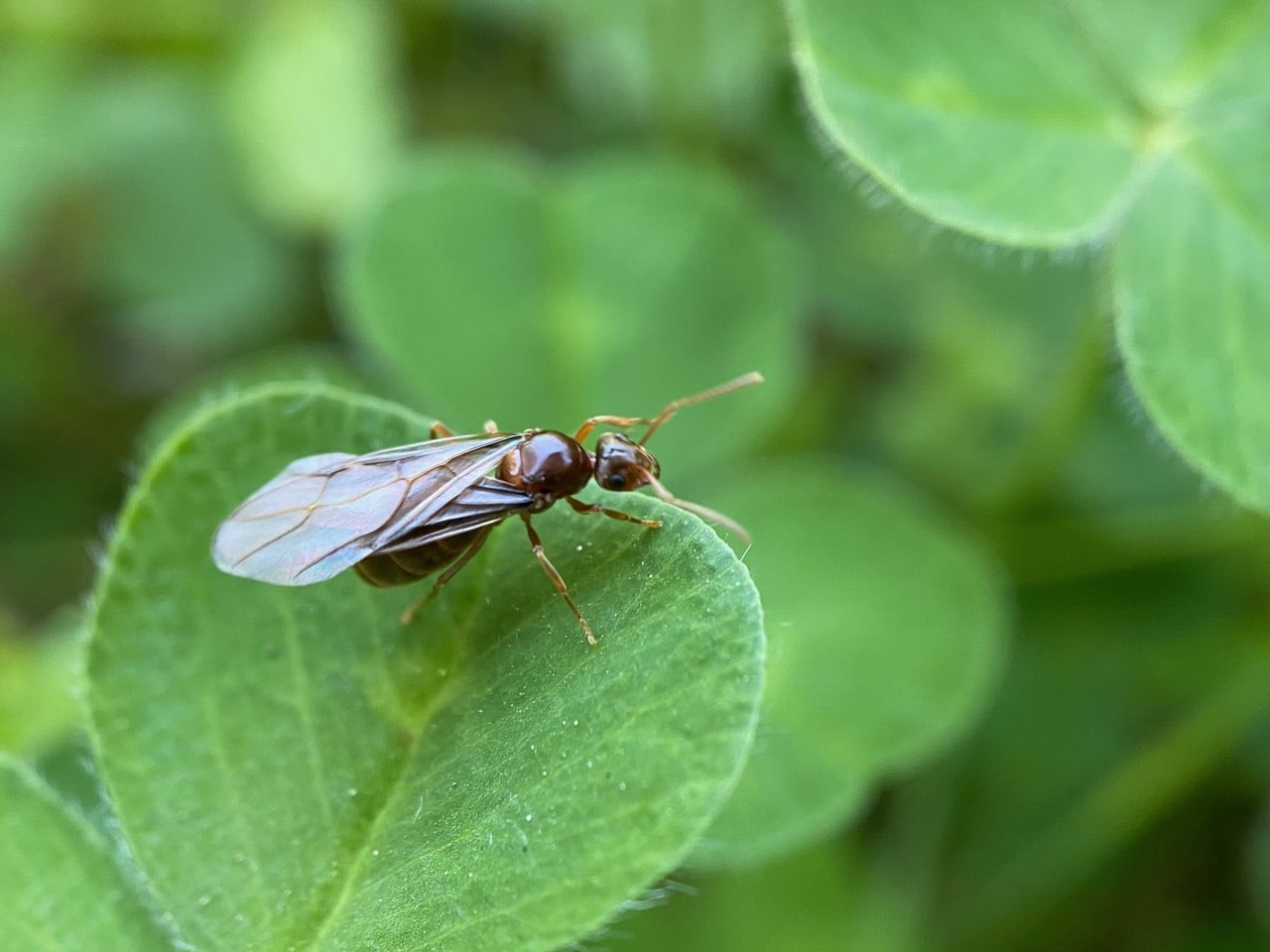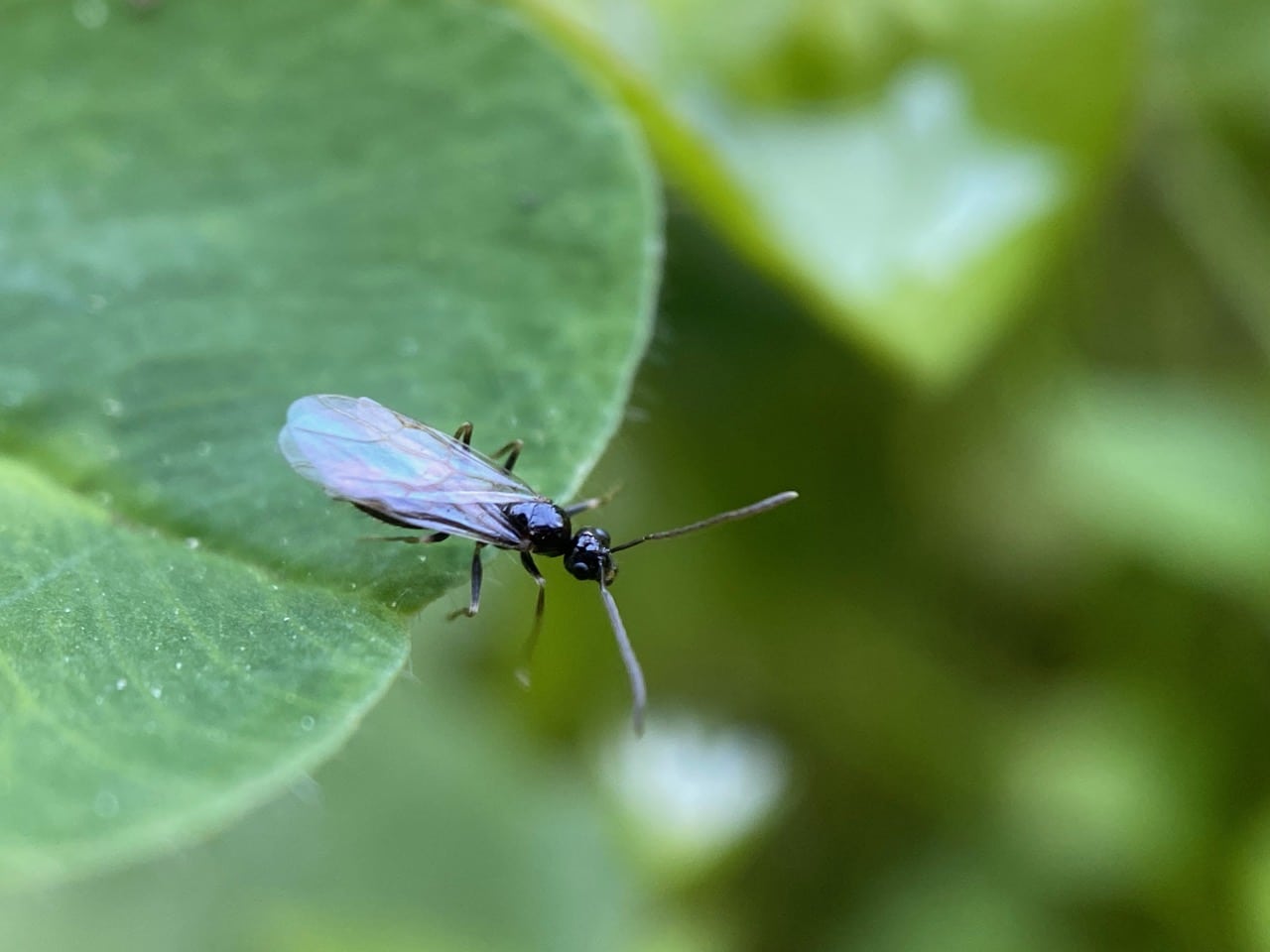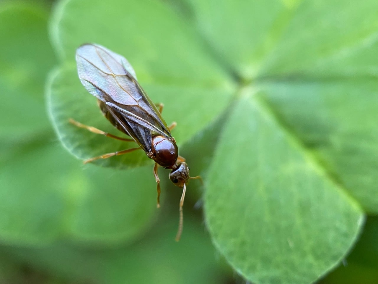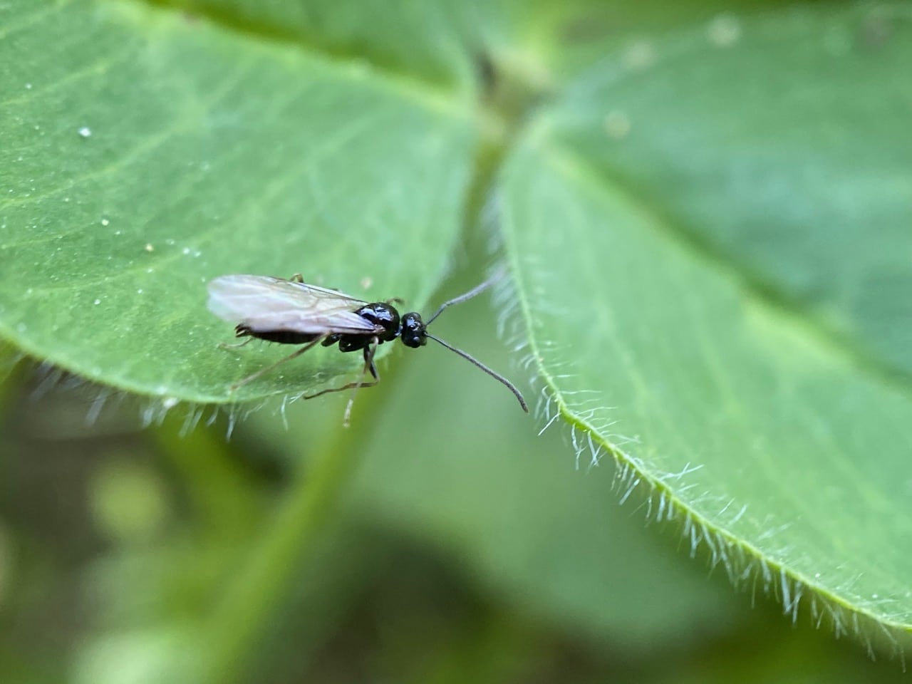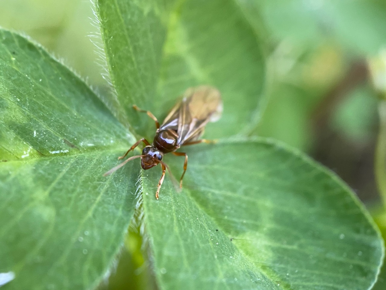 While photographing the Hybotid Dance Flies on the Miner’s Lettuce, I notice a movement in the clovers close to me – it’s a winged ant! Not only that, it is female – a queen or gyne! It must be an American Winter Ant – they are the first species in our area to have nuptial flights in the spring.