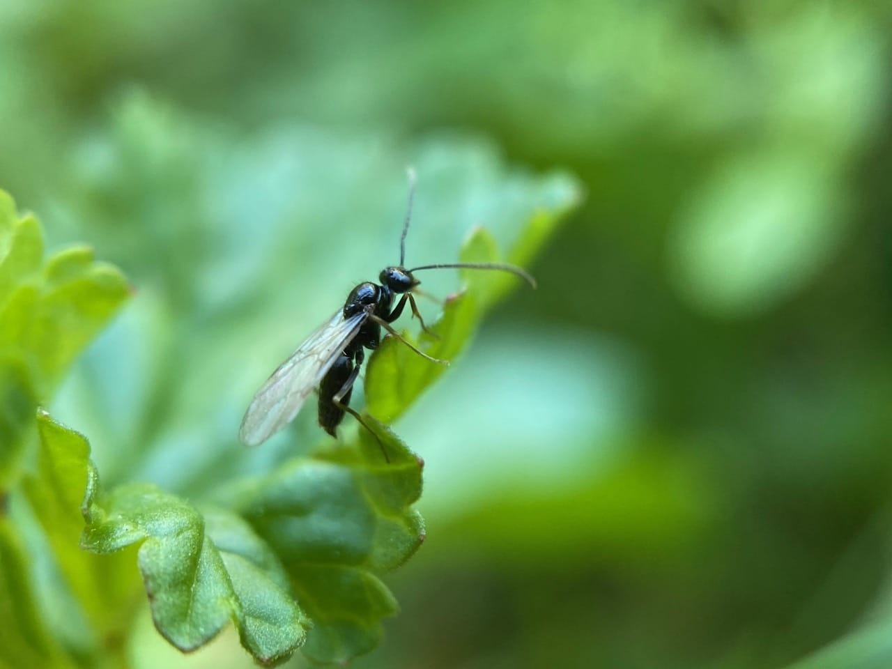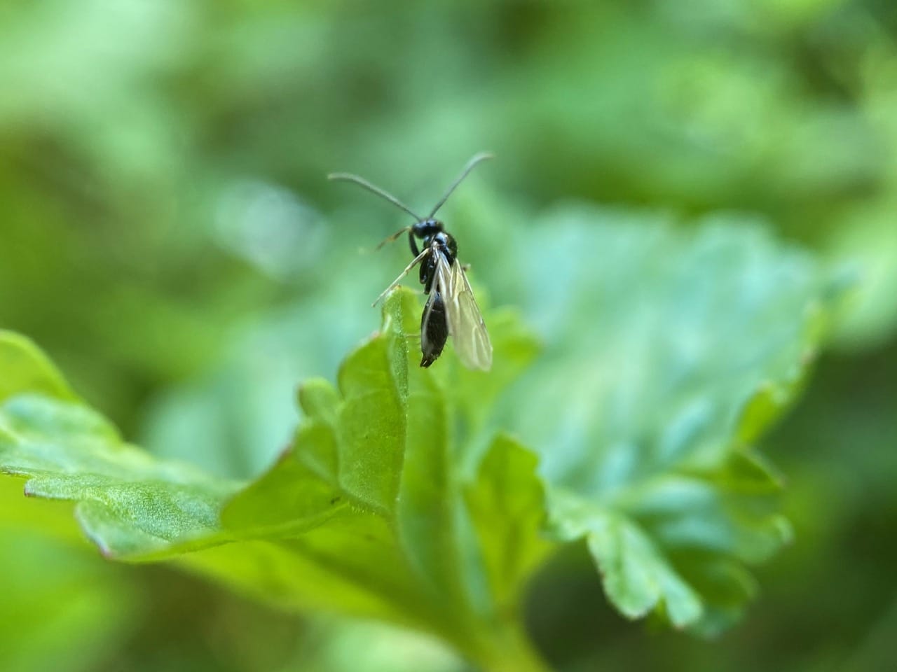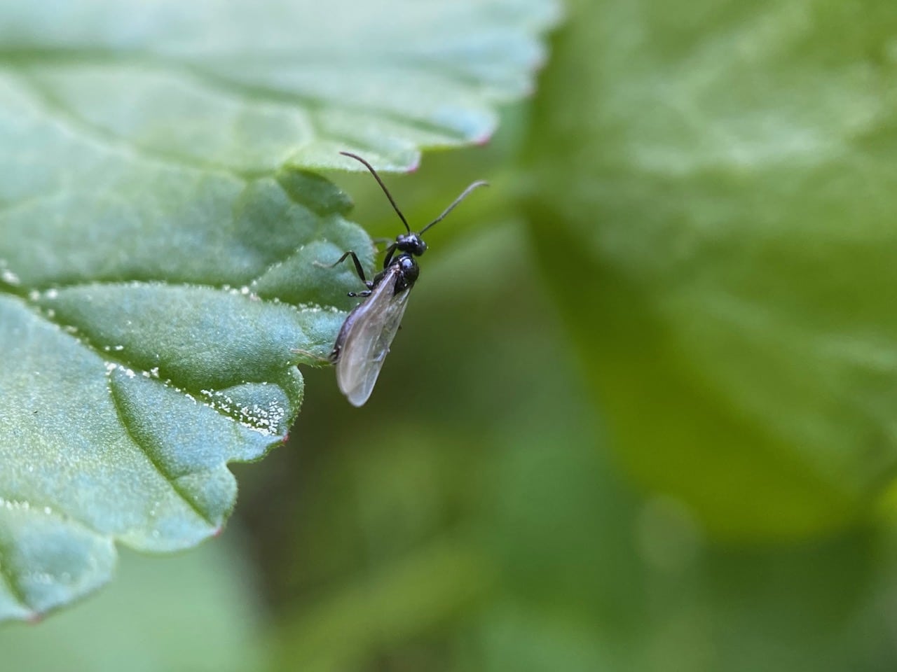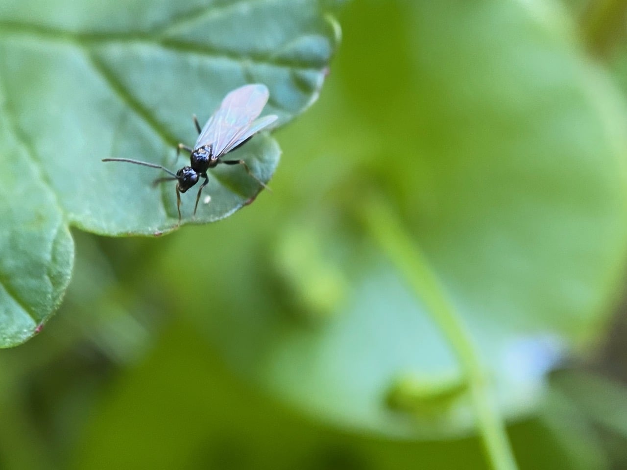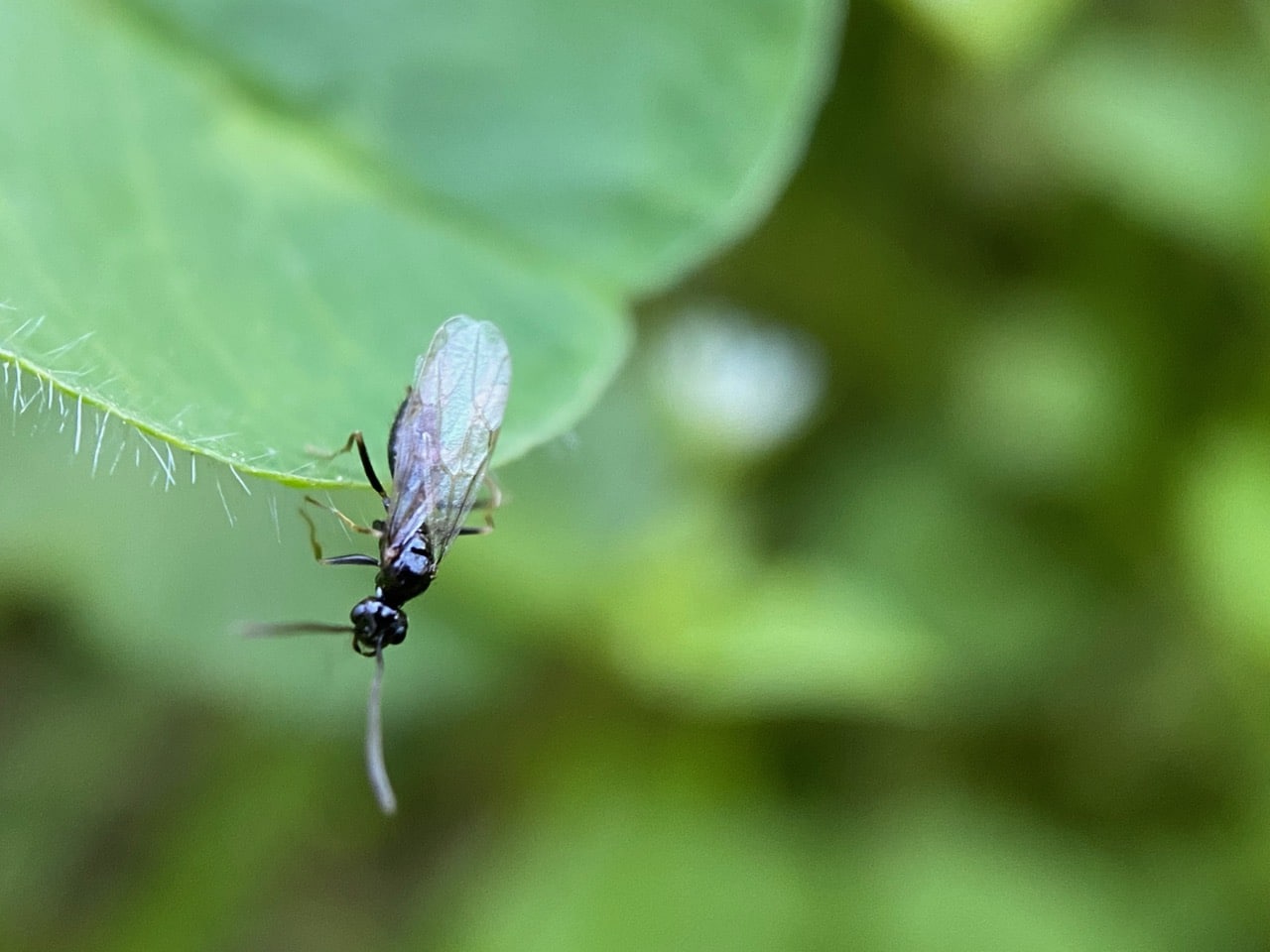 While photographing the Hybotid Dance Flies on the Miner’s Lettuce, I notice a movement in the clovers close to me – it’s a winged ant! Not only that, it is female – a queen or gyne! It must be an American Winter Ant – they are the first species in our area to have nuptial flights in the spring.