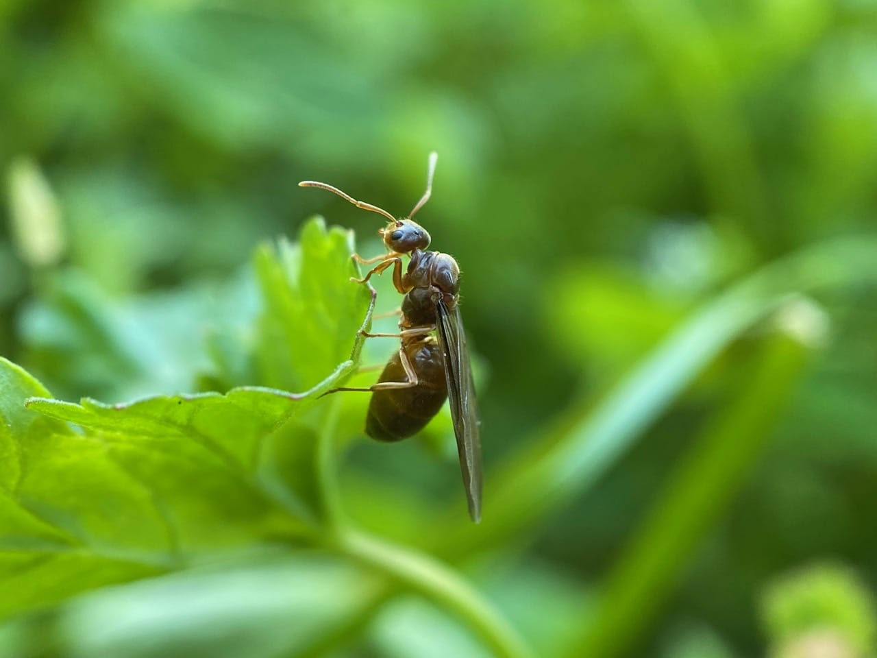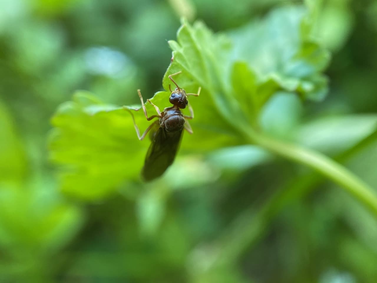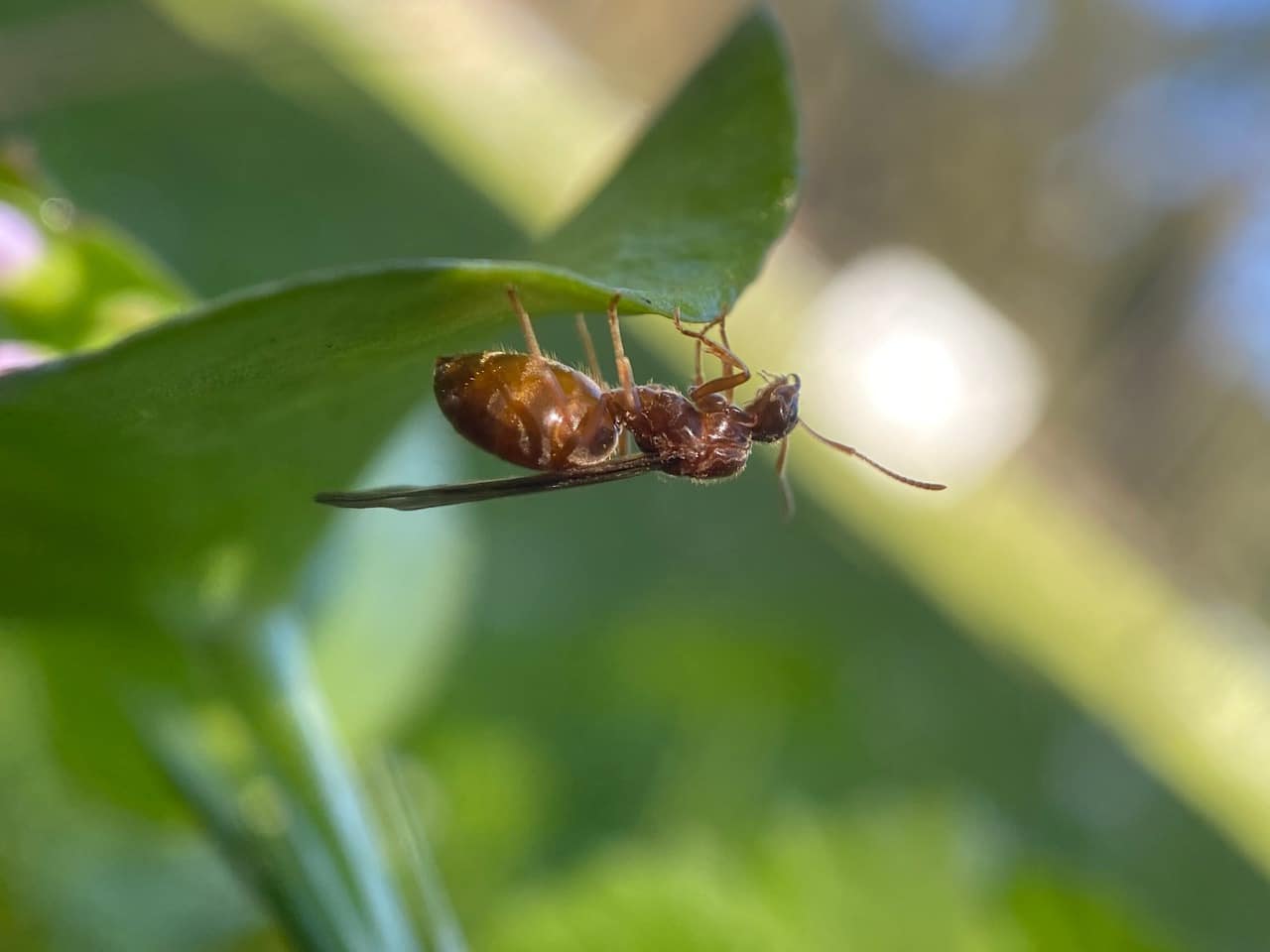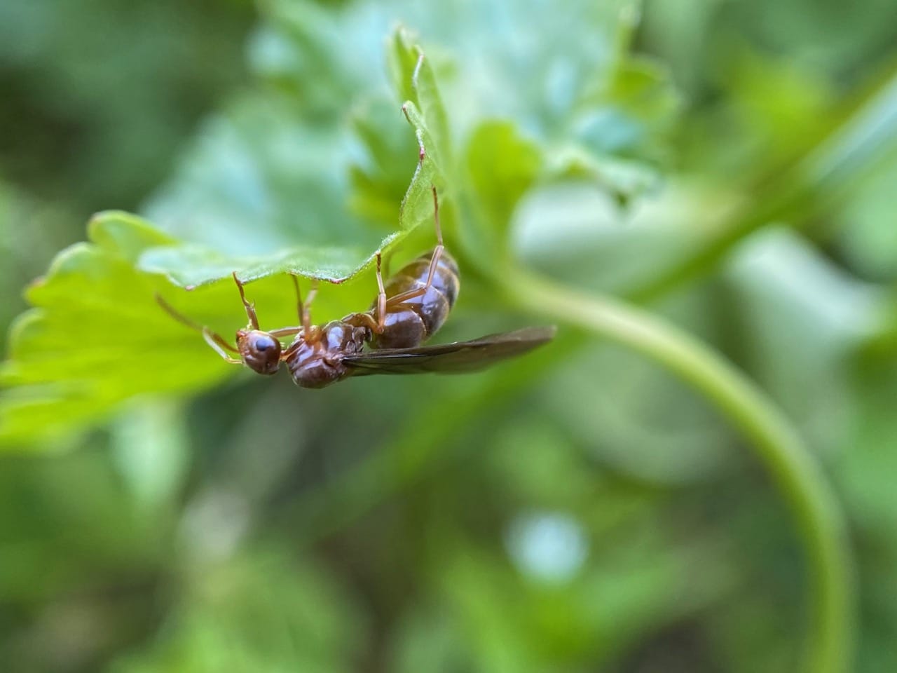 I immediately scan the surroundings for male alates (winged reproductives). None are flying, but I spot a couple running around on the vegetation. They are all black and only a fraction the size of the queen. One is closing in on our queen…